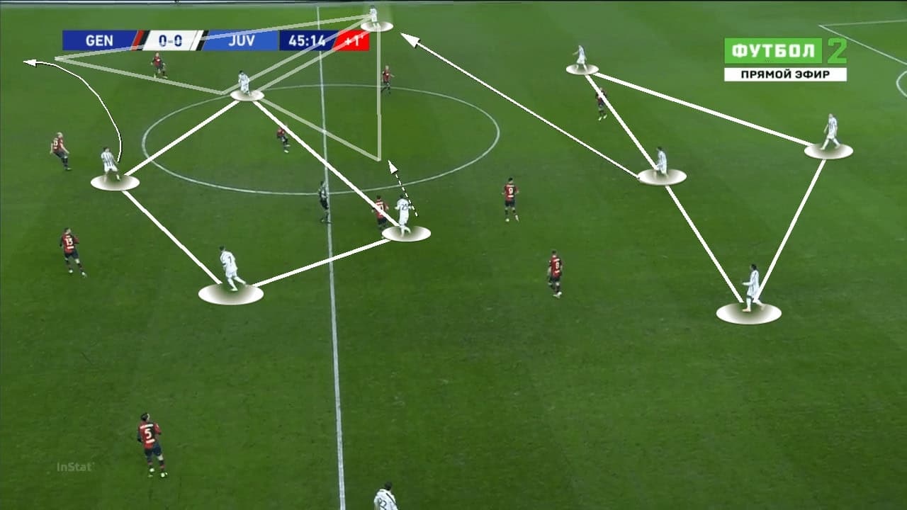 Pirlo, like other modern coaches, required two players who are able to play in the half-space, and a midfielder who can link the play through the thirds. The final piece of the puzzle is to have a striker that is mobile enough to get around the pitch and be able to link play.