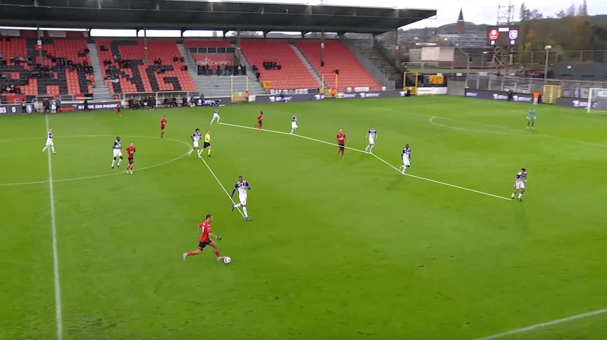 Due to the wing-back’s more passive position, the Greek central defender can find the more advanced option, playing to the feet of Verlinden. This puts the opposition wing-back in a tricky position with his decision to go out and put pressure on the wide player. This allows Michez to turn and drive towards the backline and behind the Dender defenders. This will enable Verlinden to play a pass into the space for Michez to run onto, with a corner resulting from this attacking move.