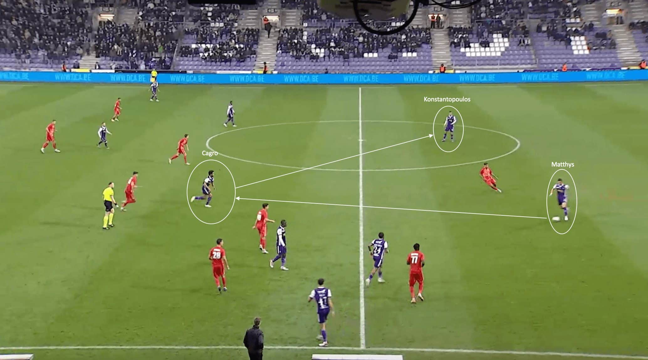 At this point, the Dender defensive shape has shifted over to this near side, looking to suffocate the Beerschot attackers. However, after receiving possession, Cagro is able to find Apostolos Konstantopoulos, with the Greek central defender unmarked inside his own half. This quick ball circulation allows Wieland’s side to escape the pressure and quickly get out the other side, catching the opposition defence out of shape.