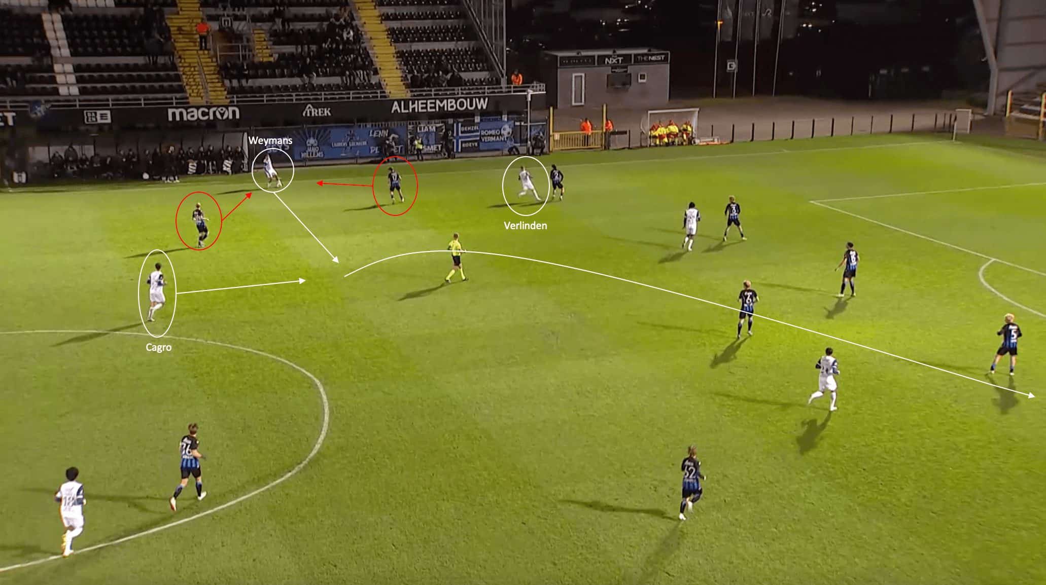 The image above shows another example of an attacking move from Beerschot, showing how the wide channels are not always used to progress the ball into the final third directly but rather as decoys to open up space centrally. In this phase of play above from a recent match against Club Brugge Nxt, the ball is in possession of the left-sided wing-back, Marco Weymans. Further forward, Thibaud Verlinden made a decoy run, with the Belgian looking to show a give-and-go with the wing-back.