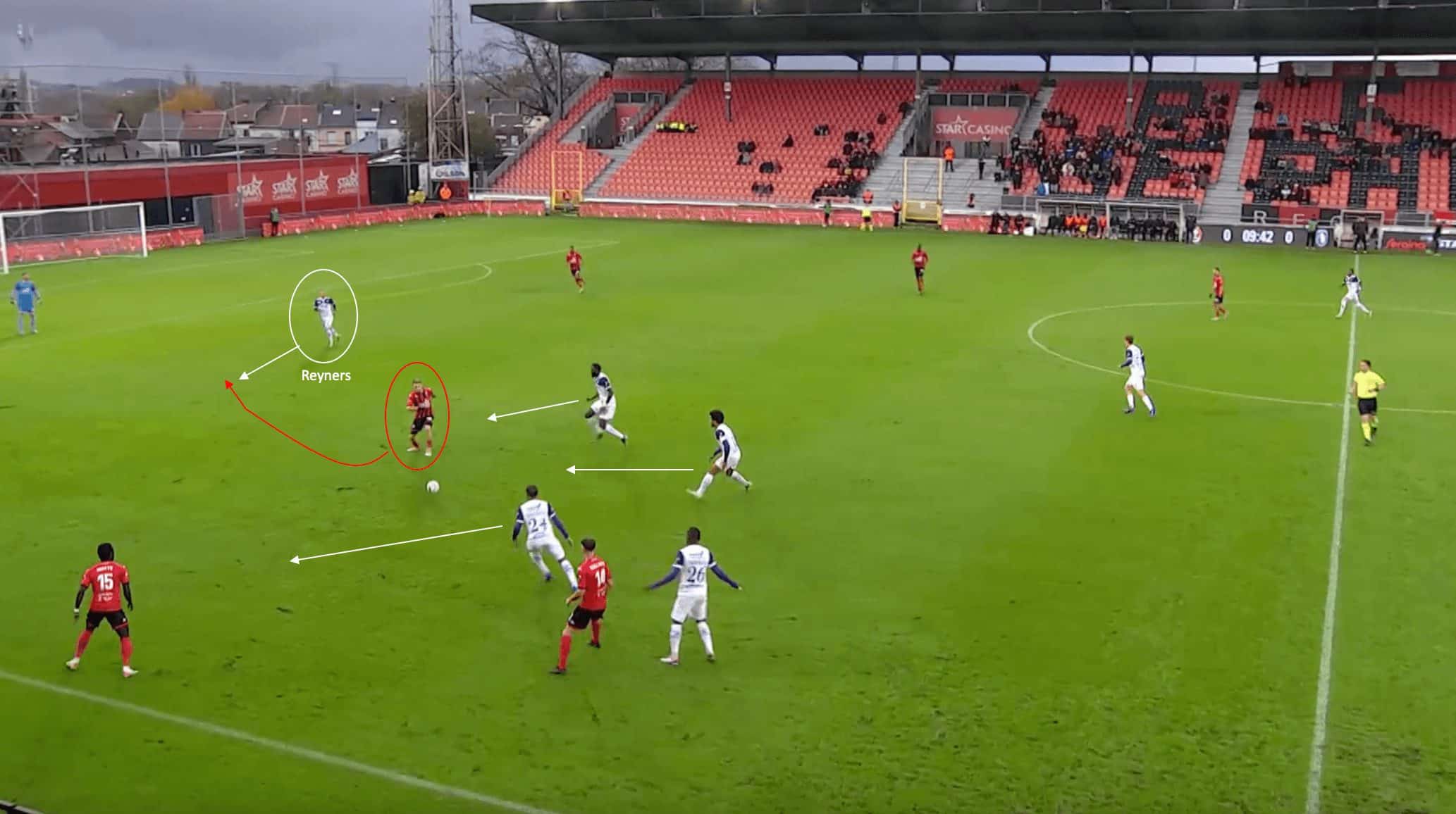 The Seraing player in possession is then left with only two realistic options: the wing-back on the touchline, who would instantly get closed down, or attempting to play back to this goalkeeper to build out the other side. The opposition player chooses the latter, with him blindly playing a pass back to his goalkeeper. He does not notice the movement of the Beerschot forward, Tom Reyners, sliding over to cut off this passing lane. As a result, the ball is played right to Reyners, who finishes past the goalkeeper in a 1v1 situation.