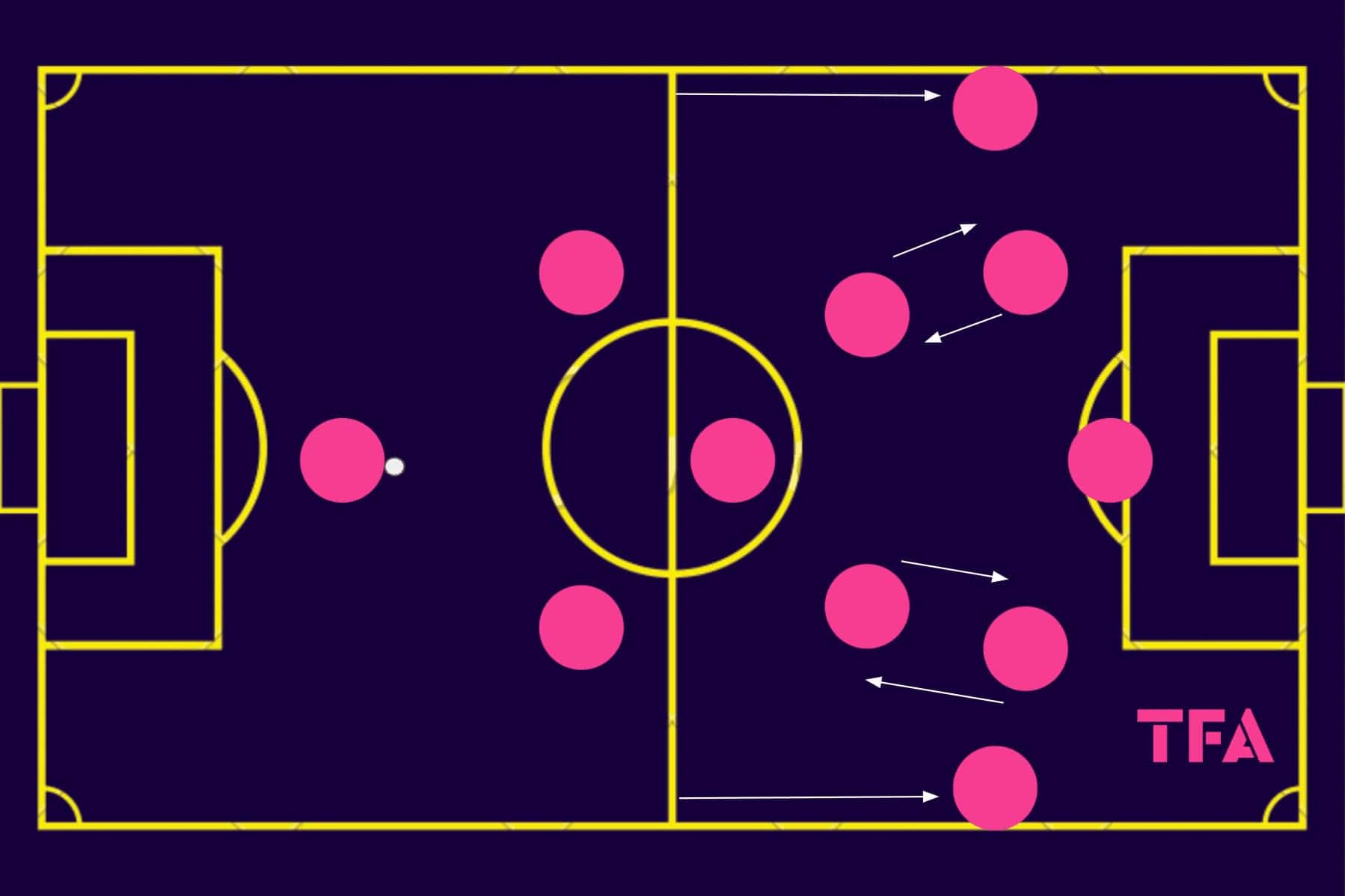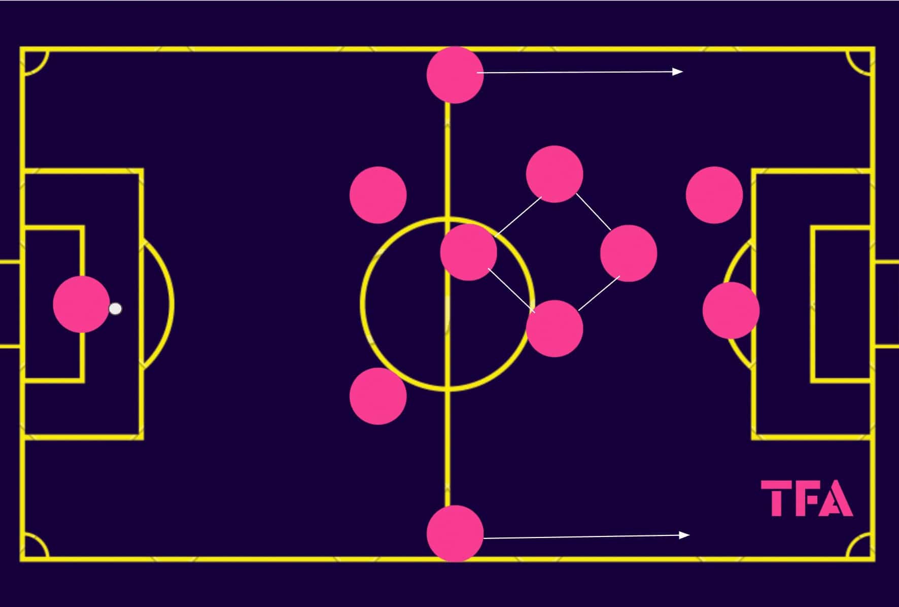 When they force their opponents out wide, their press will typically increase in intensity, with the full-back on that side jumping to press high while the central diamond will also shift over, as a unit, to congest the space and increase pressure on that wide ball carrier.