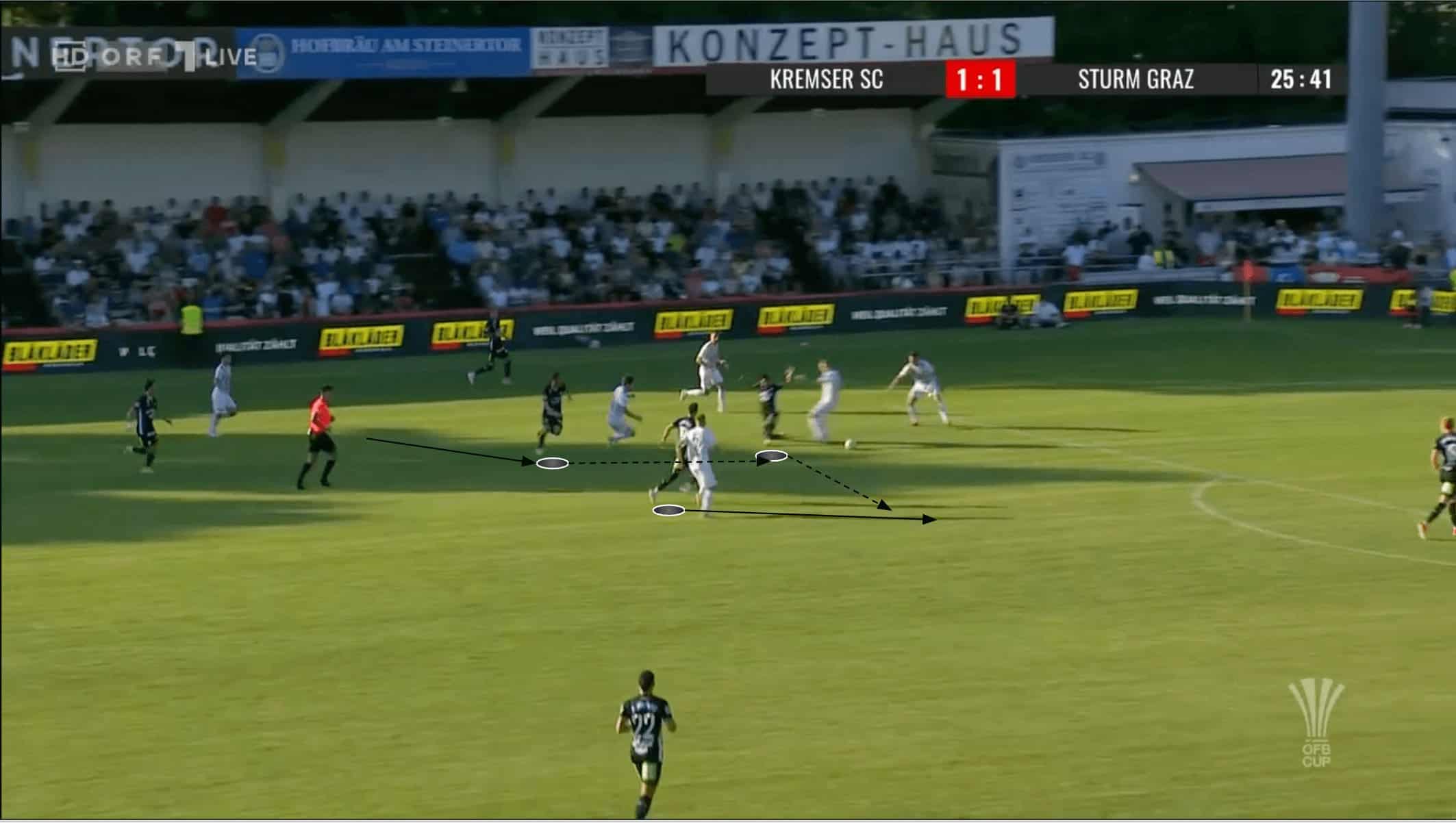This is a prime example of how Sturm Graz’s close proximity (while still respecting each other’s need for a reasonable amount of space in which to operate) in the middle of the park can facilitate very effective, quick passages of intricate link-up play capable of carving the opposition wide open.
