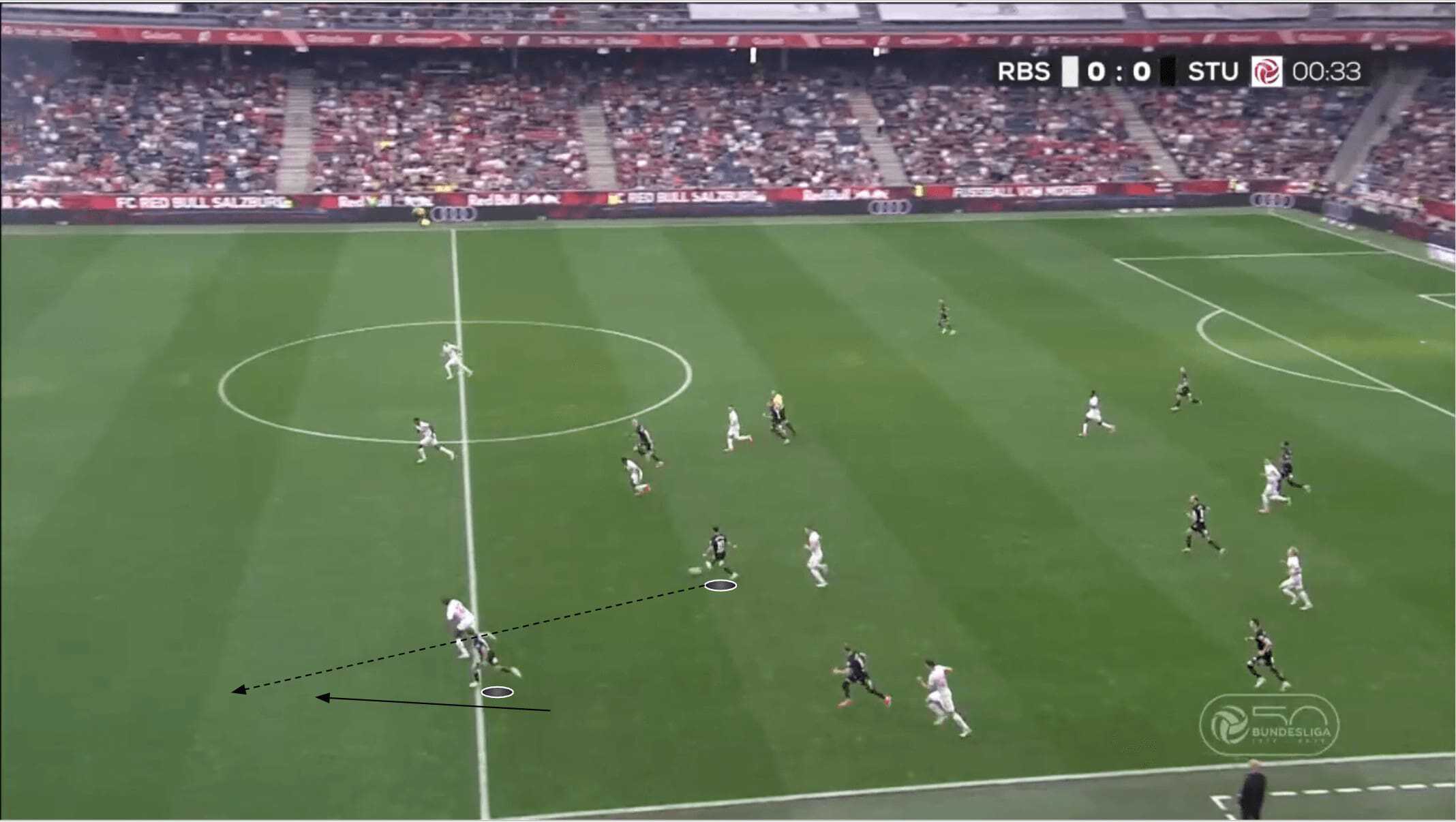 As the ‘10’ receives, Sturm Graz’s left striker makes a killer run in behind the opposition’s backline, which the midfield playmaker spots and can immediately try to take advantage of.