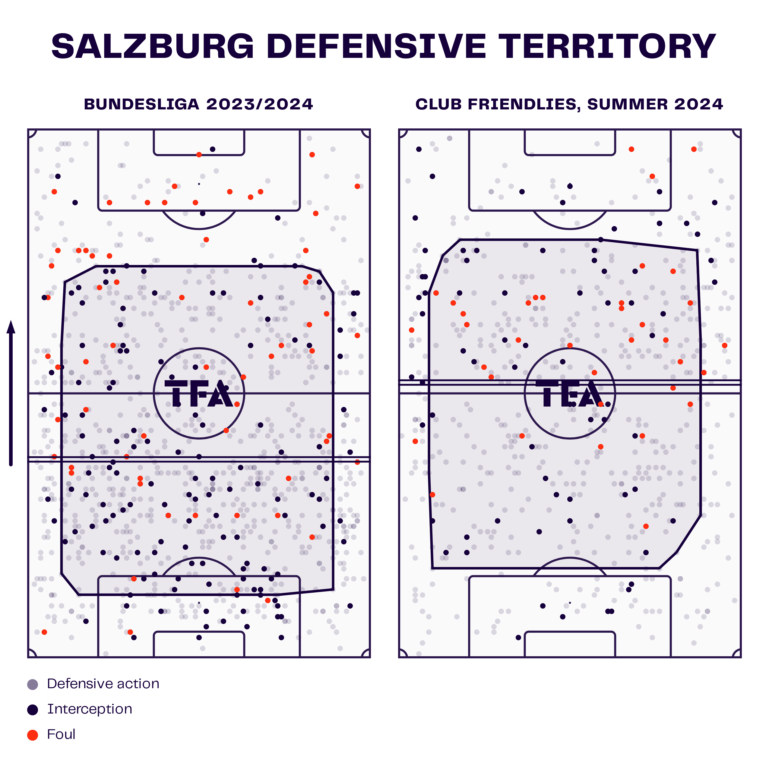 Figure 2 shows Red Bull Salzburg’s defensive territory map for the 2023/24 Austrian Bundesliga campaign compared with their summer friendlies this summer.
