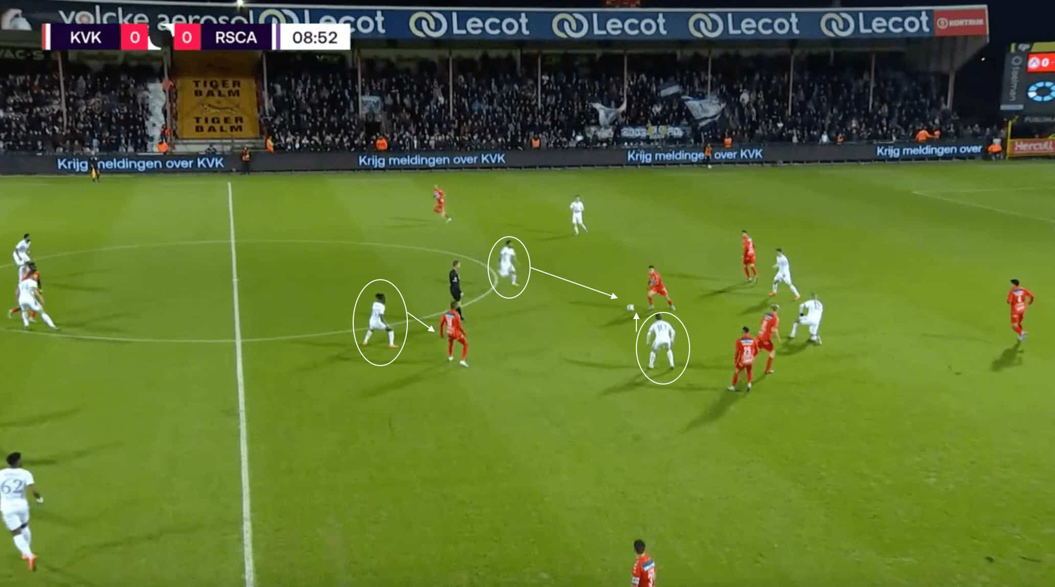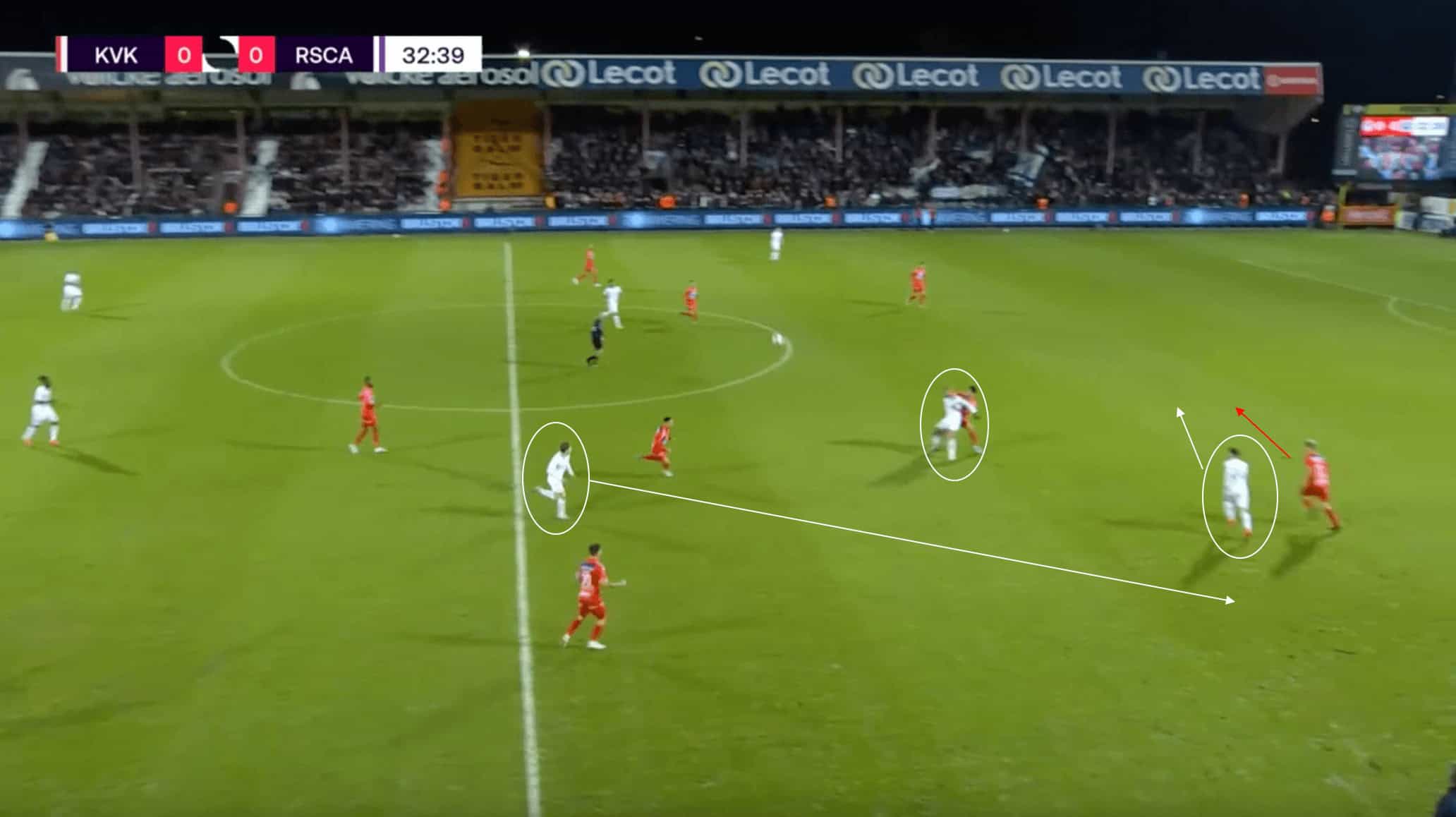 As a result of these two off-the-ball movements, the deeper-lying midfielder makes an in-to-out run from deep, moving into this wide space left vacant by the Kortrijk fullback.