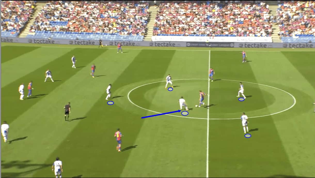 Here, as the holding midfielder receives, he’s forced to play back to the defence, and after a couple of passes, the ball ends up returning to the left side of the pitch, where the opposition finally decides to try and move forward.