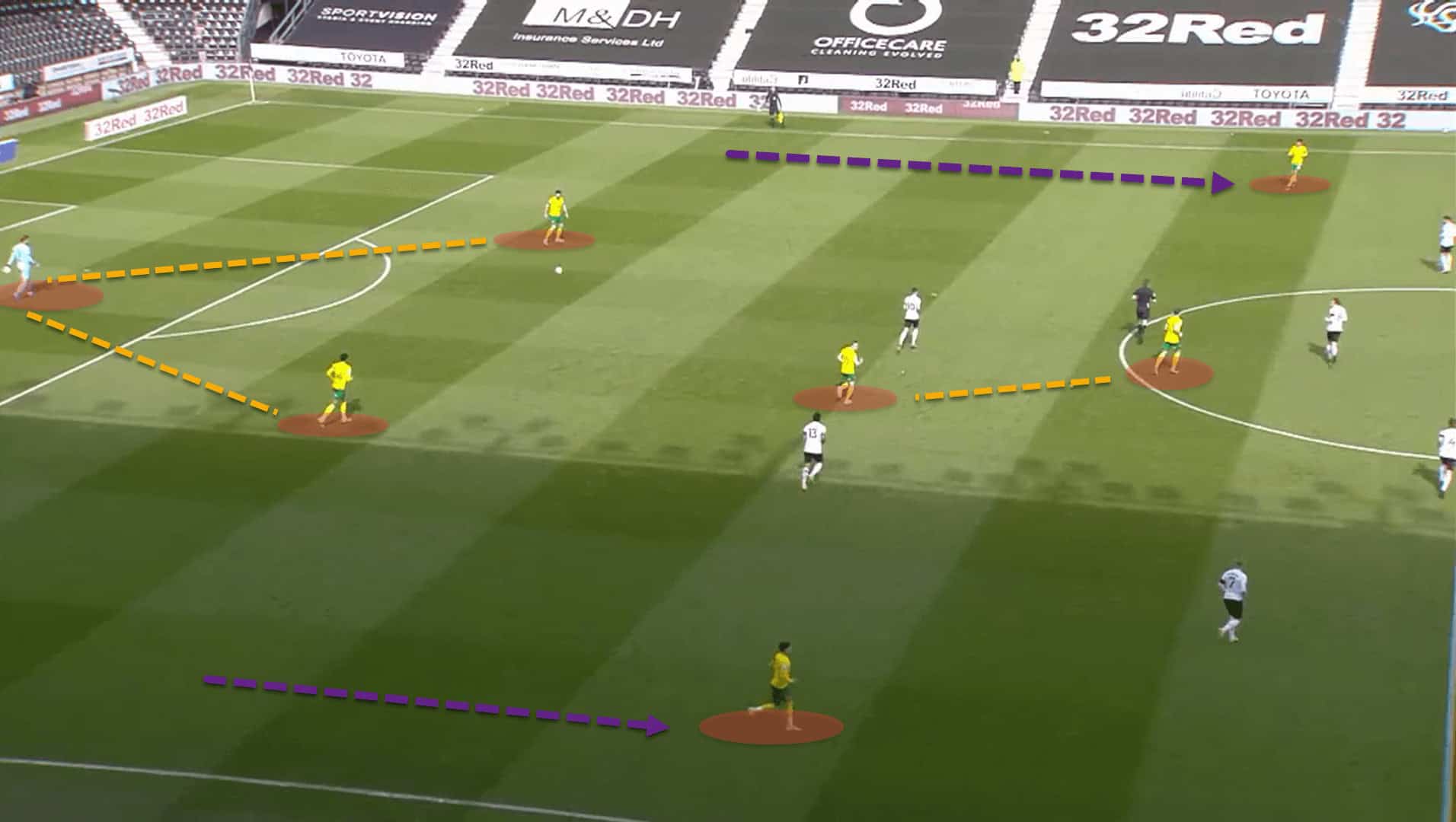 The Canaries always looked to build out from the goalkeeper and play their way through the thirds of the pitch using quick passing on the floor. Norwich had plenty of width, depth and central occupation between the opponent’s lines.