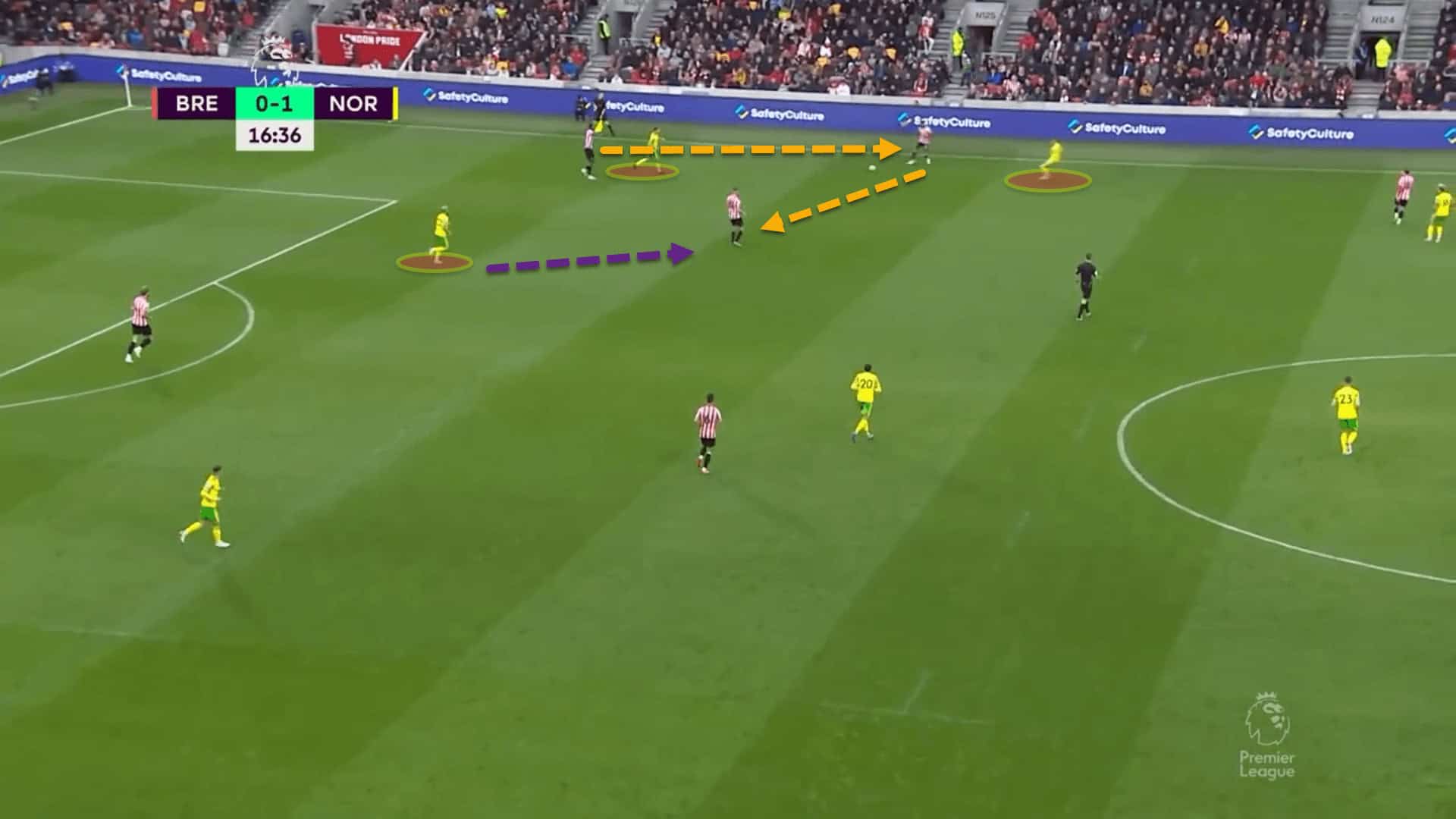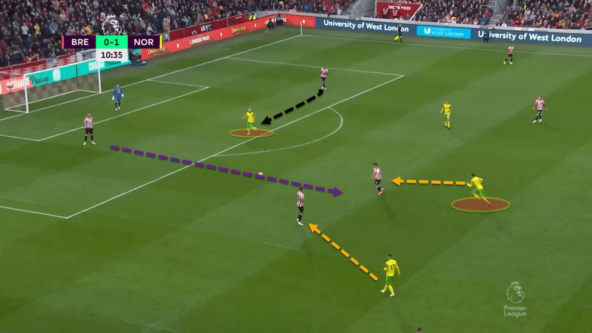 However, Norwich’s midfield is far too late to react. The trap fails and Brentford can easily play out from the danger. Again, here, in the same match, Norwich tried to trap the Bees in their hive out wide, but the press was half-hearted, and players did not fulfil their jobs correctly of blocking off passing lanes.