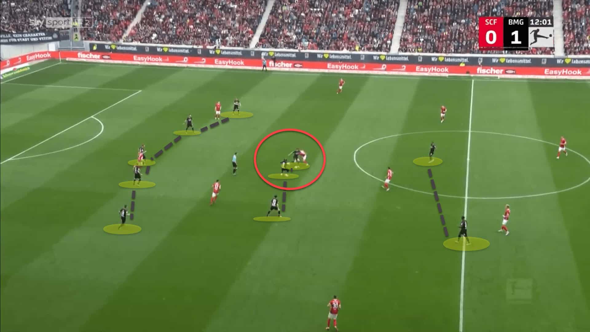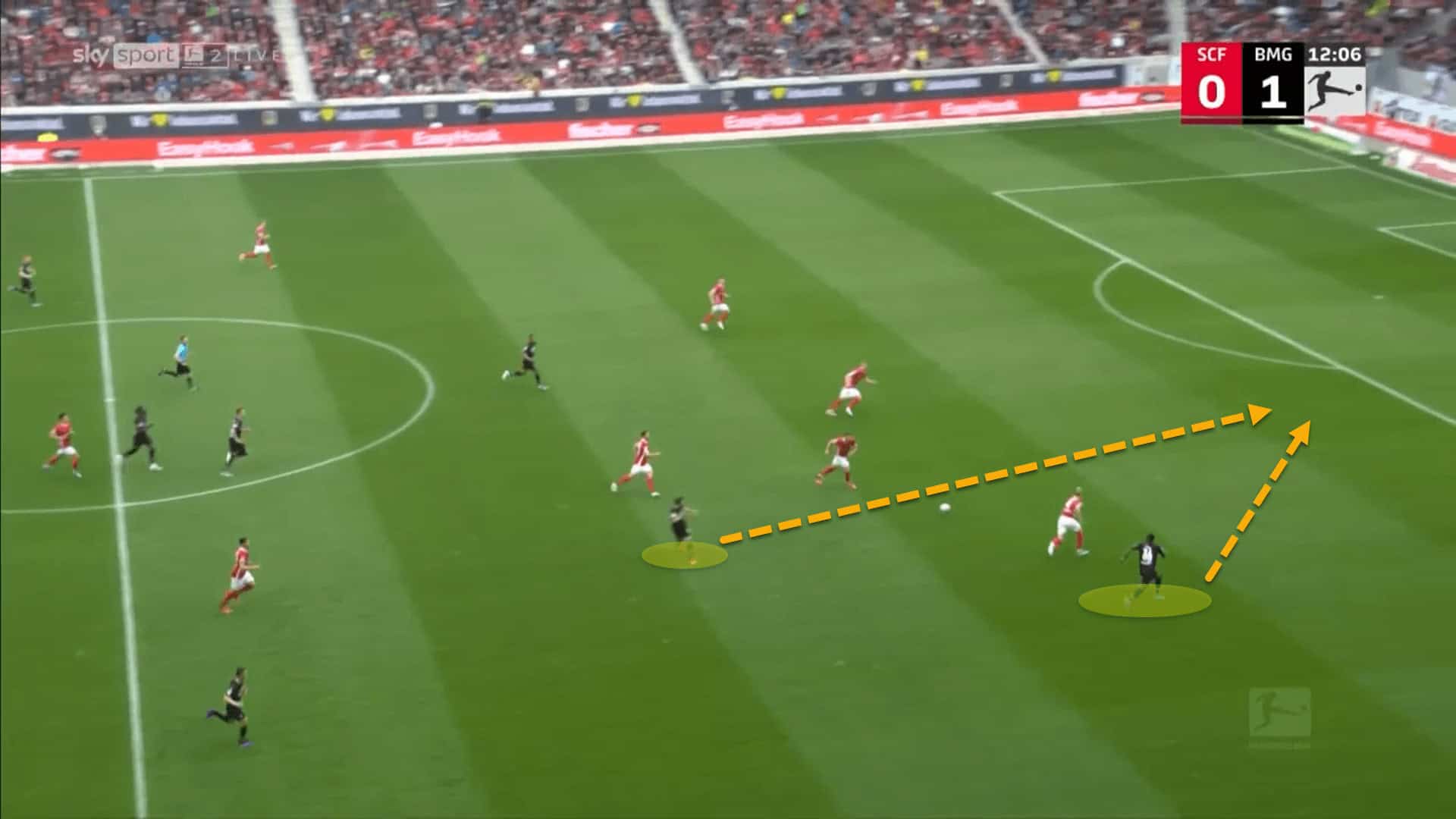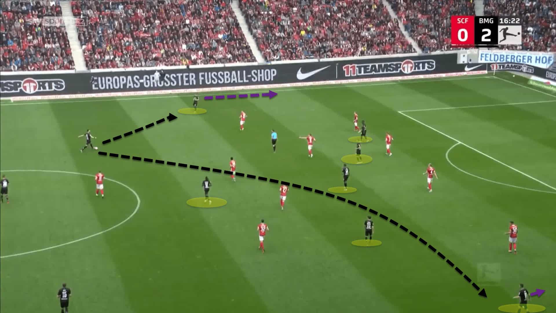 This image shows a near-identical situation to the one prior involving Norwich and Everton. This time though, through their 3-5-2 shape, Mönchengladbach have positioned four players between the lines, occupying Freiburg’s midfield and backline.