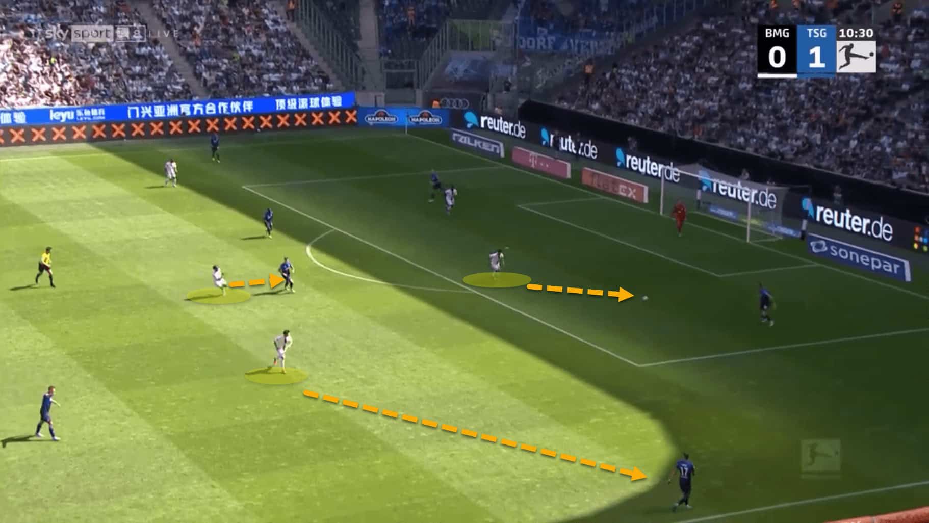This has left the wingbacks free to receive the ball in advanced positions. From there, Mönchengladbach looked to create crossing opportunities from the flanks, using centre-forwards such as Marcus Thuram, Breel Embolo and Alassane Pléa as targets in the box.