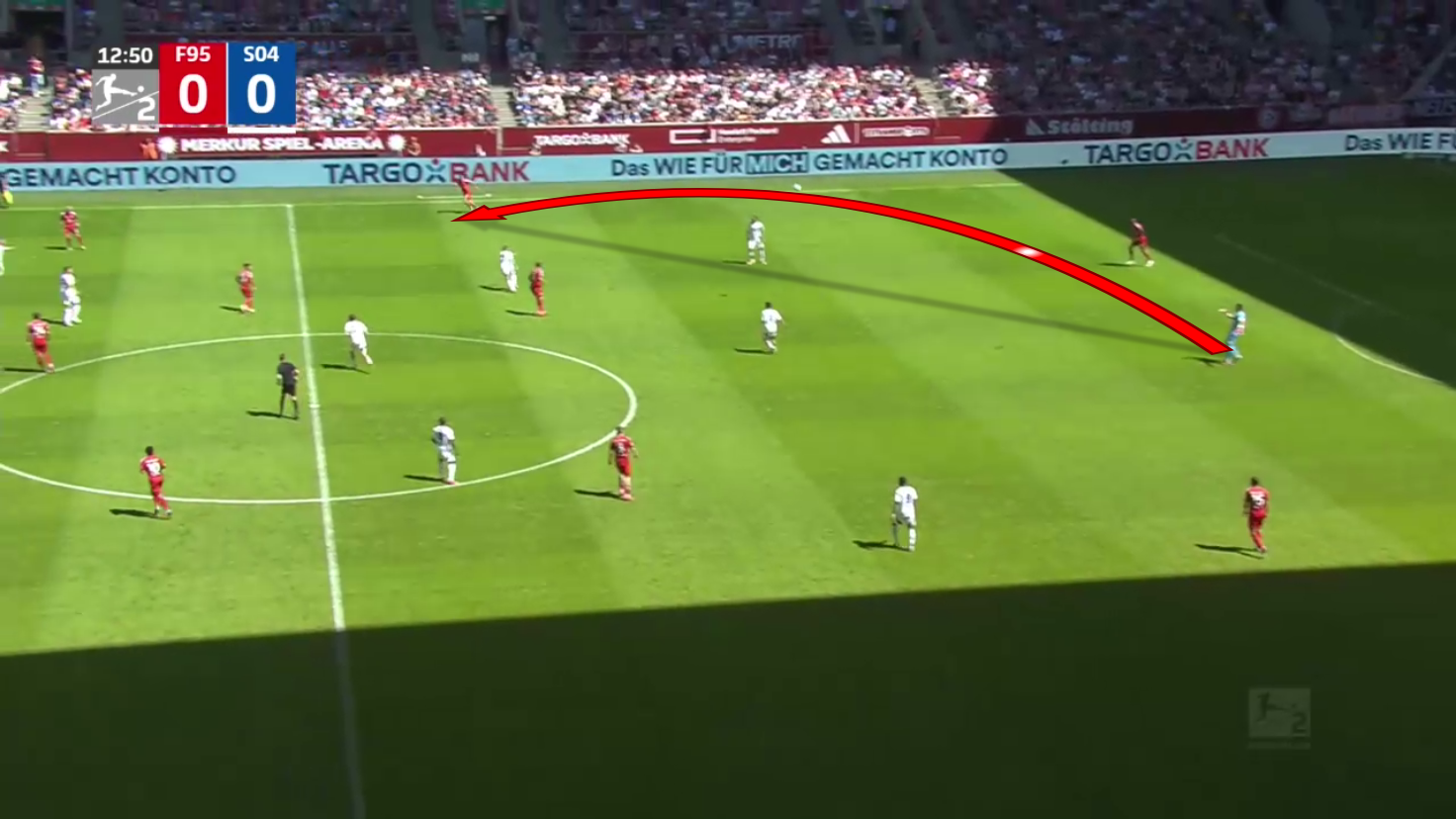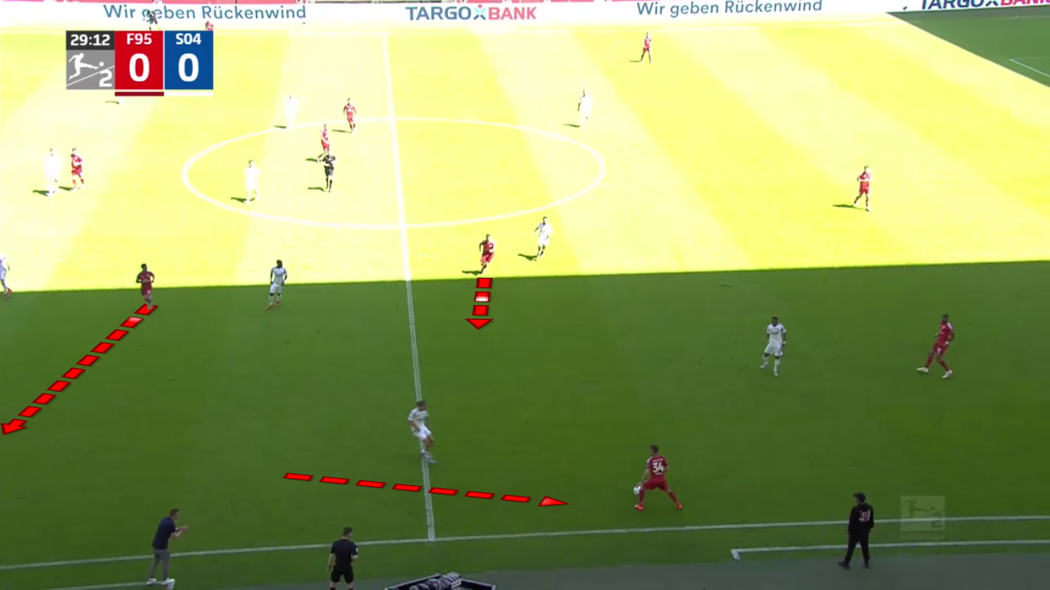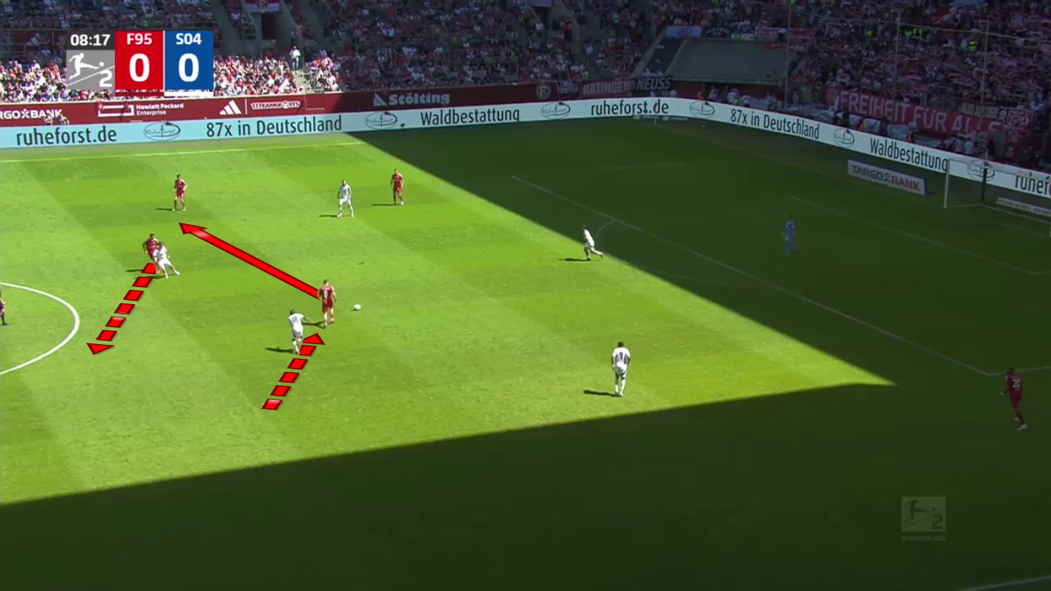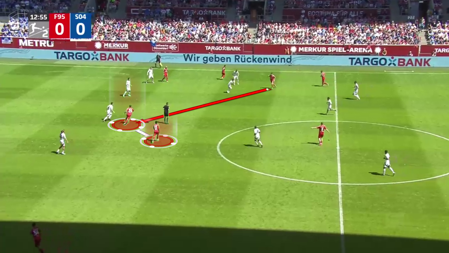 As we can see, the centre-backs and the goalkeeper are pushed very high up the field in this situation, but their opponent, Schalke 04, decided not to press them so as not to play into Düsseldorf‘s strengths.