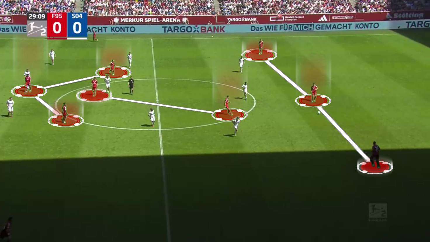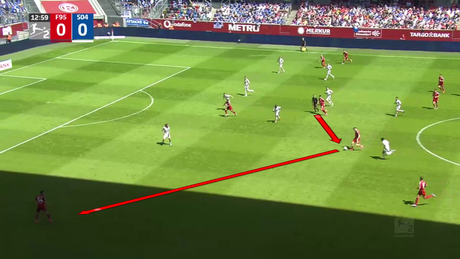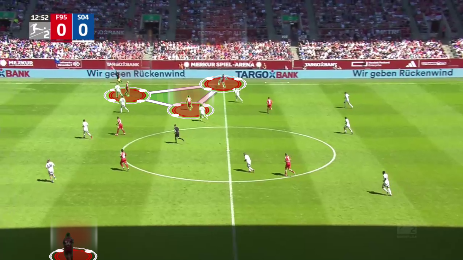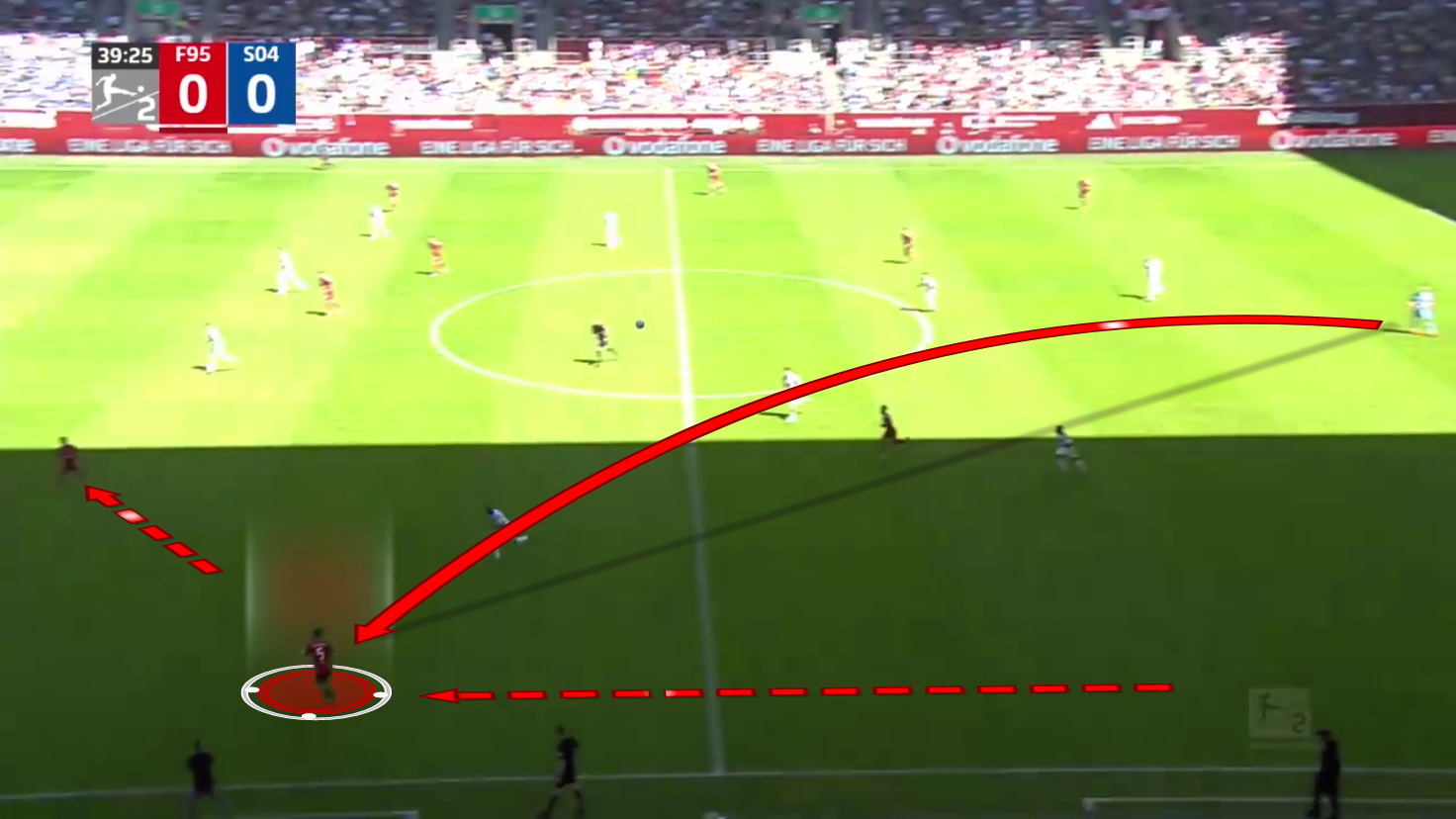 As we can see, the centre-backs and the goalkeeper are pushed very high up the field in this situation, but their opponent, Schalke 04, decided not to press them so as not to play into Düsseldorf‘s strengths.