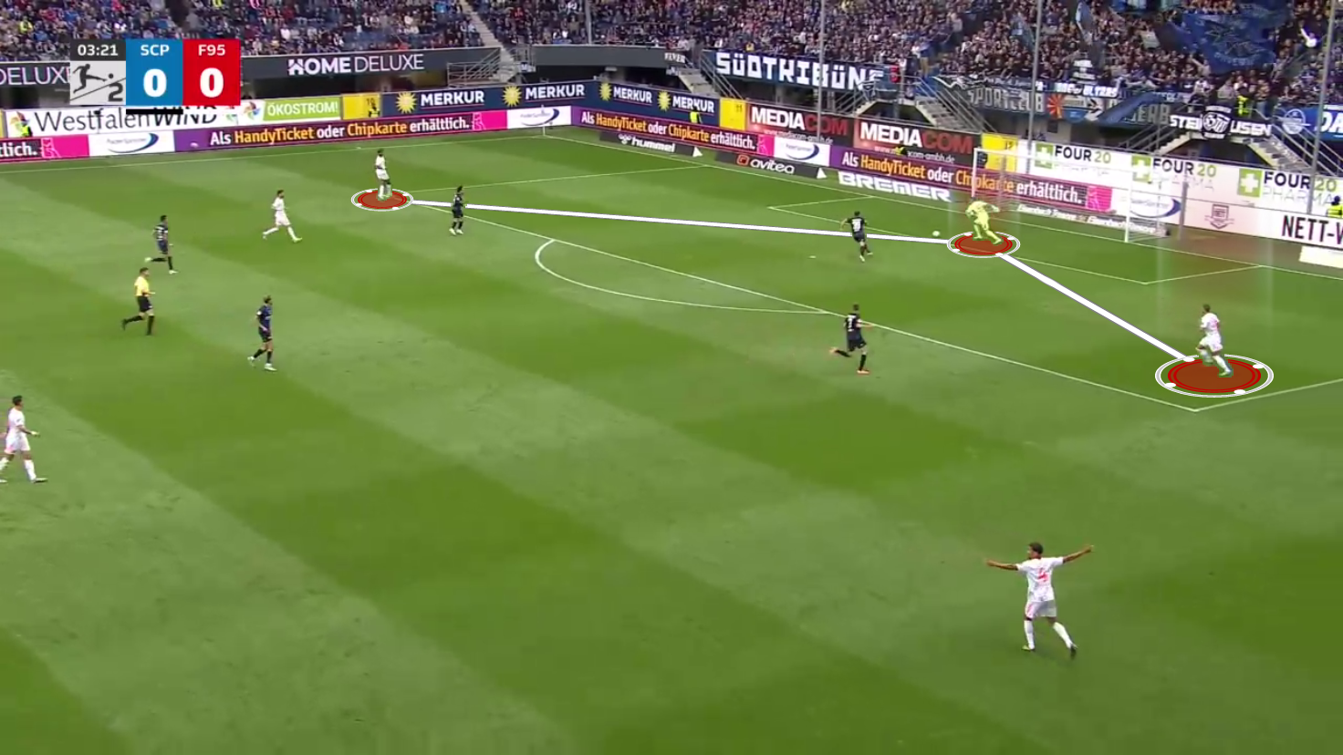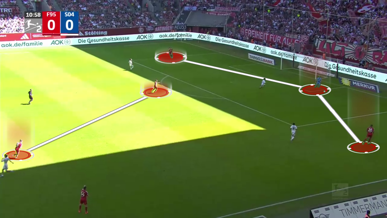 From then on, the wide centre-backs or full-backs positioned themselves to receive a first-time pass from the midfielder, and Düsseldorf often found solutions through the triangle to advance the ball with just two quick passes.