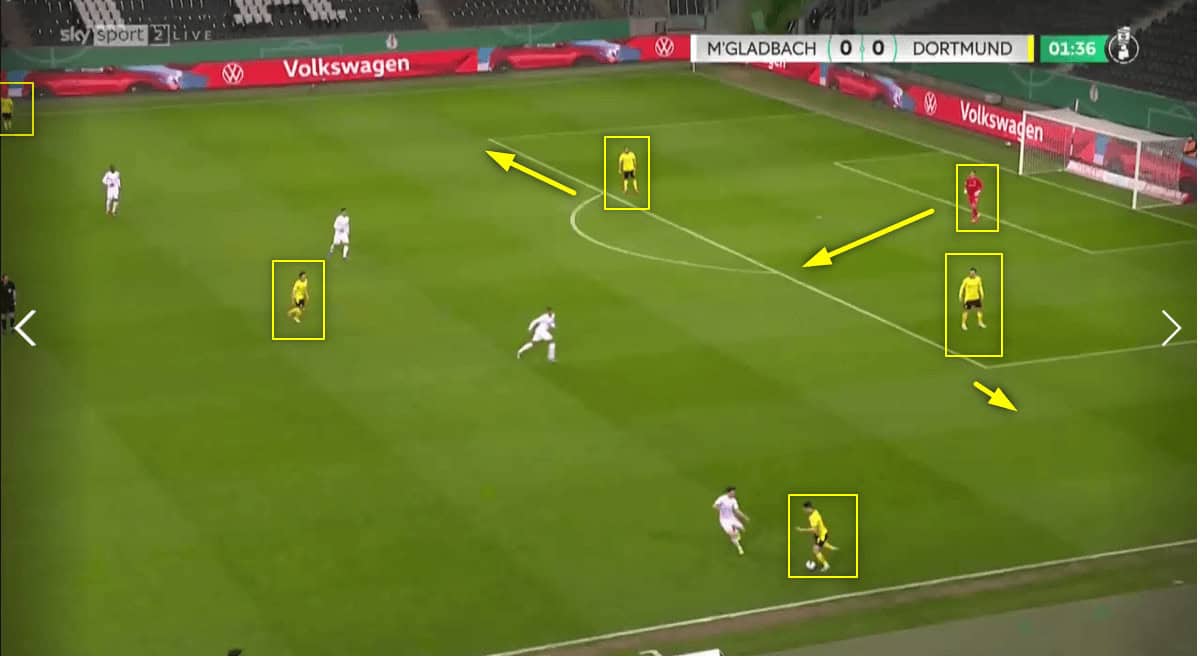 The image below shows a high 4-1-4-1 defensive block. As Sancho presses the man holding possession. Haaland is starting his run towards the centre back about to receive the ball. However, the pressing strategy instructed by Terzic means Haaland won’t aggressively press the centre back. He will arch his run and cut off the passing lane and stop Monchengladbach from opening up the pitch.