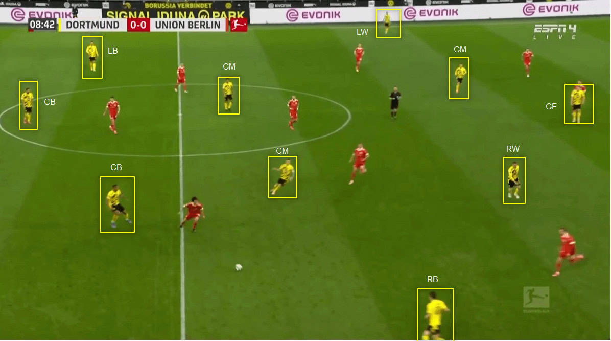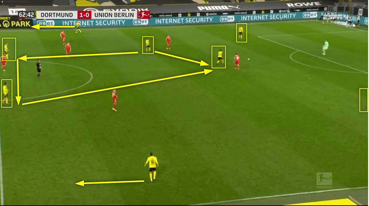 Part of Edin Terzic’s tactics is for Dortmund to attack the opposition with different patterns. Look at how the attacking approach differs in the same game Union Berlin, and how the position of the players has changed. This time both full-backs are pushing higher and one of the midfielders has dropped deeper to form the three-man defensive line. They are now attacking in a 3-1-3-3 shape. As the fullbacks move higher, they outnumber Union’s back four as Dortmund attacking line becomes a front five.