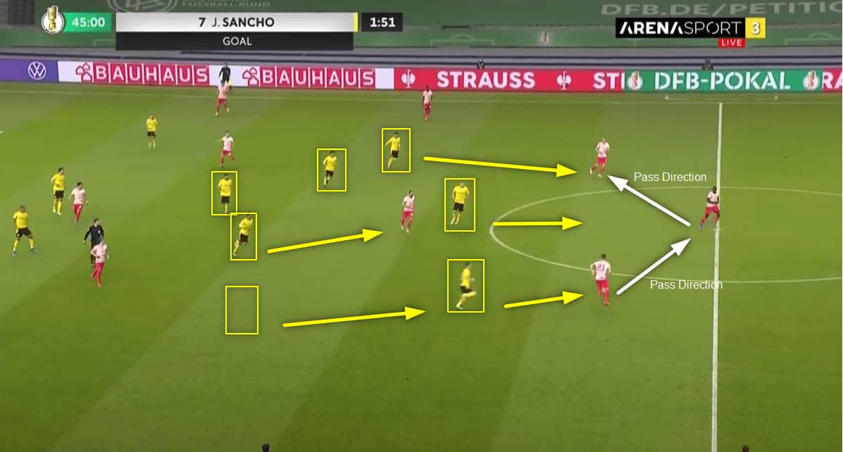 Defensively, the same troubles remained, and Dortmund was often exposed between the lines during the opposition’s build-up and the space behind the fullbacks during attacking transition. Leipzig have three players positioned between Dortmund’s defensive lines and right across their defensive third.