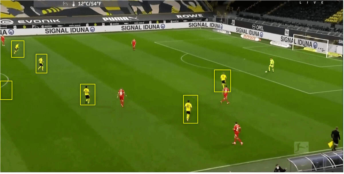 Following this, Terzic changed Dortmund’s defensive shape. Although the 4-2-3-1 approach was sometimes still used, a 4-3-3 was primarily adopted so Dortmund defended in a 4-1-4-1 shape.