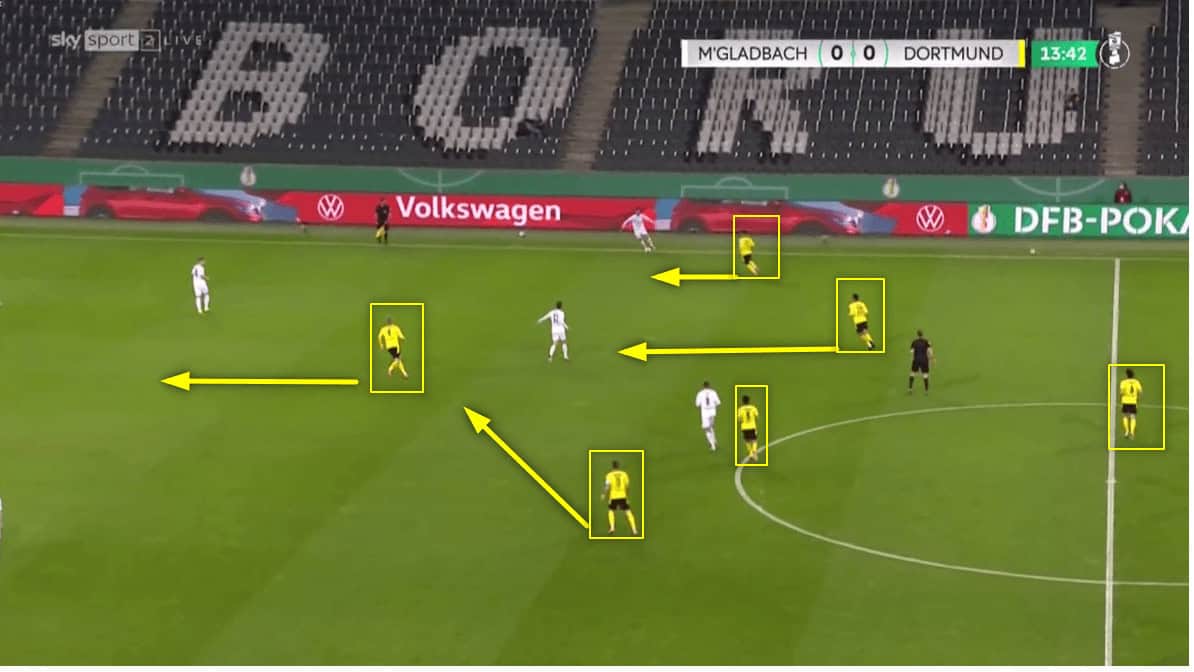 As the pitch becomes smaller and when all viable passing lanes are blocked, Dortmund will then look to win the ball back by counter-pressing.