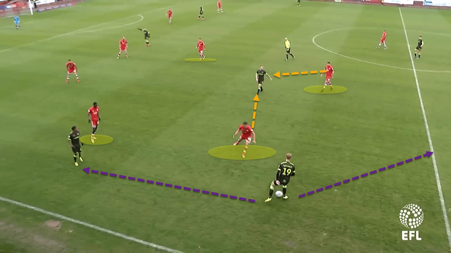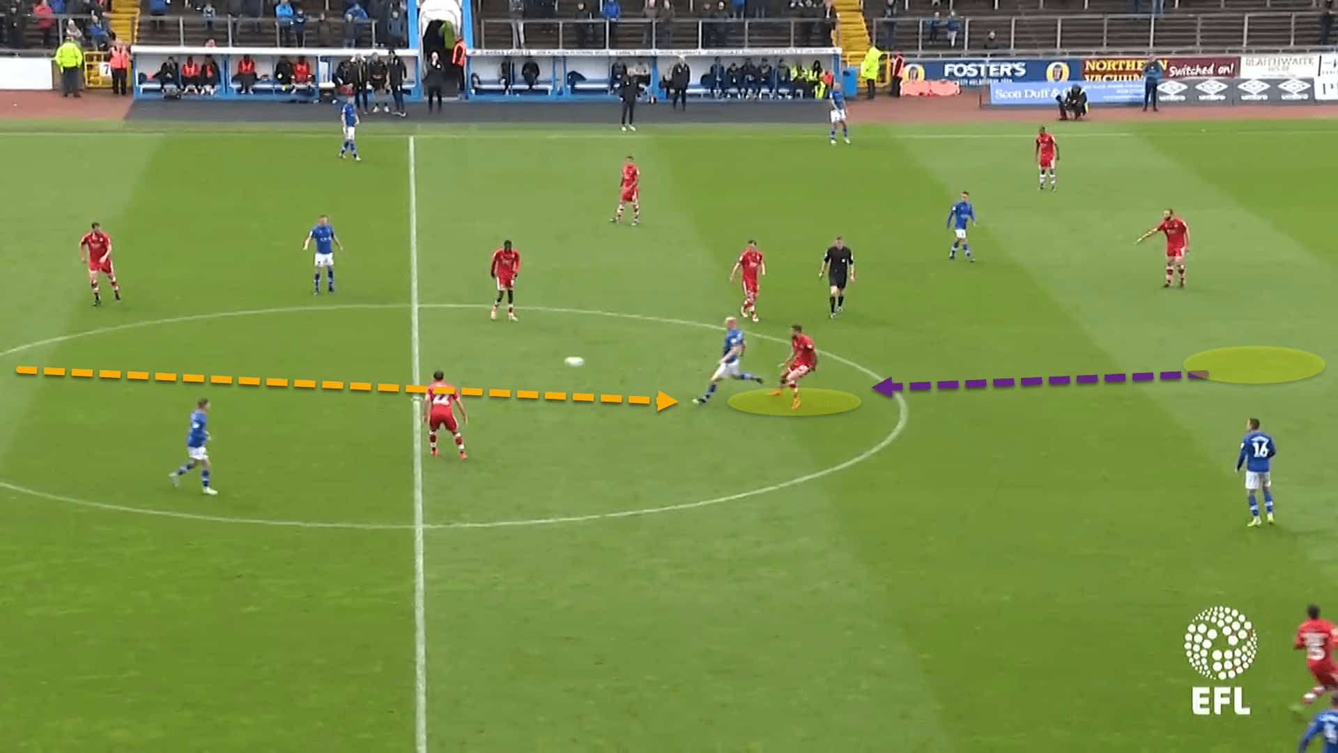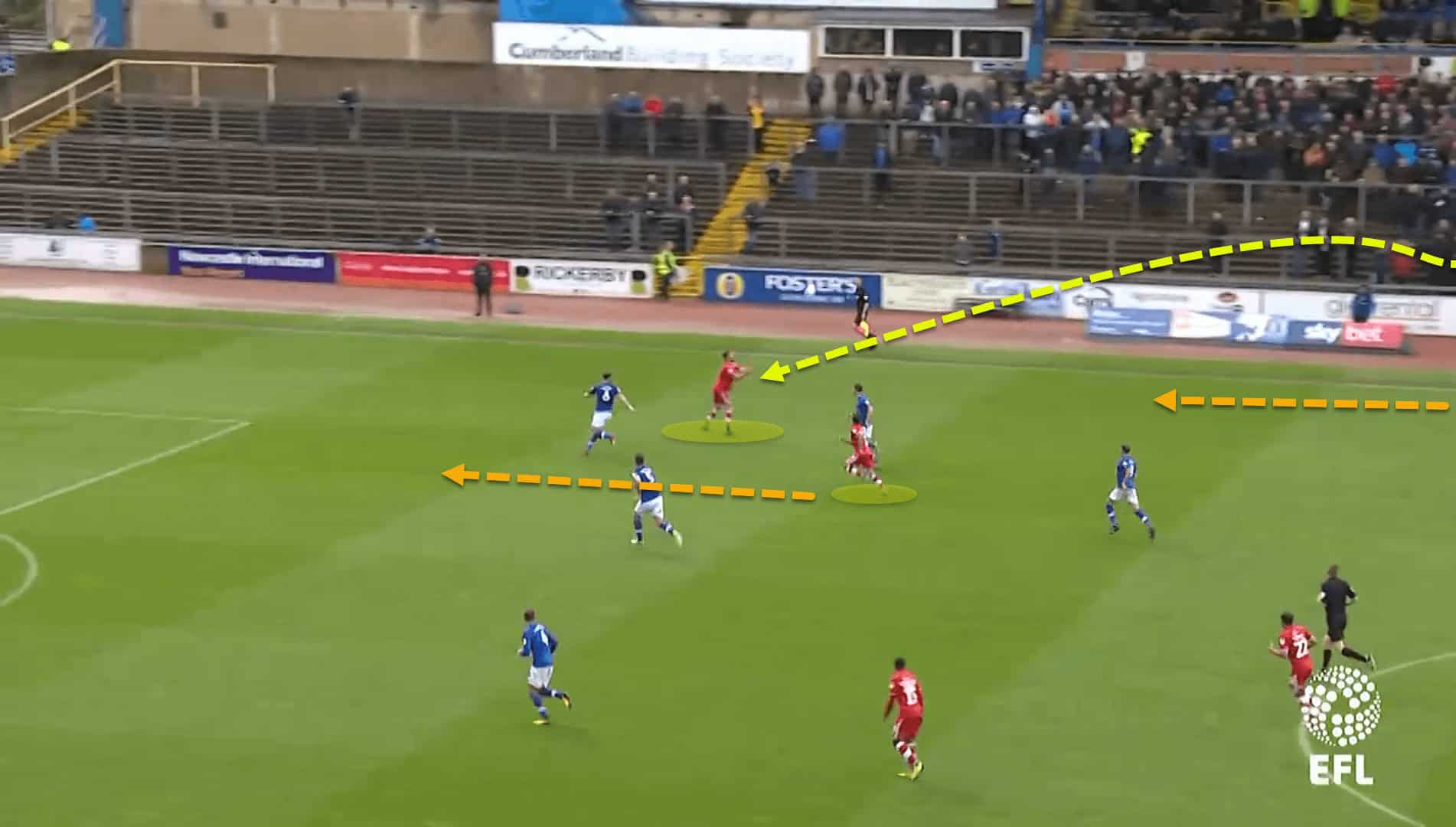 In this example, Carlisle United are building out from deep in their own half of the pitch. Crawley, under the guidance of Cioffi, are more than happy to allow them to have the ball with their backline, choosing to cut off access into the space between the lines instead.