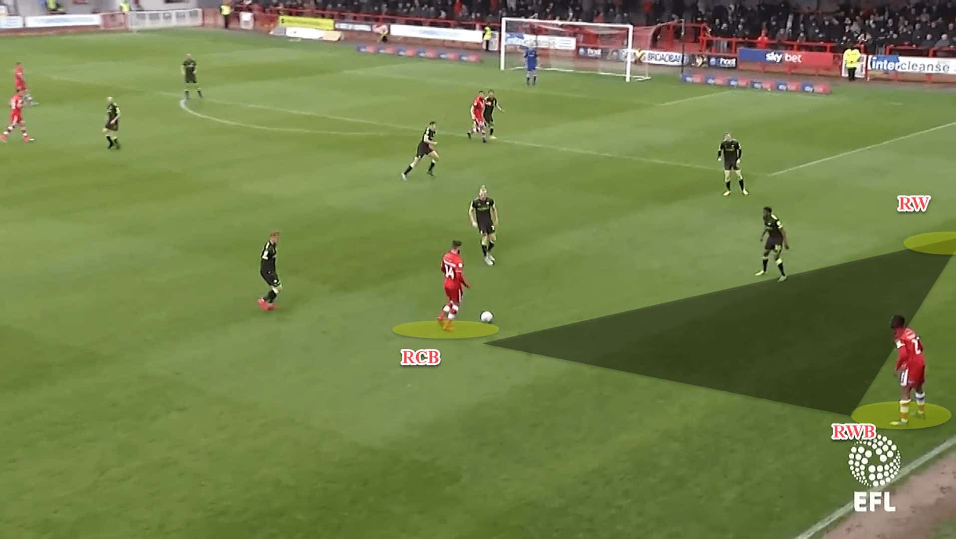 For instance, here, Crawley’s right centre-back has bombed on up the right flank to form a triangle with his right wingback and right-winger. Generally, the nearest central midfielder would shift across too to complete the overload.