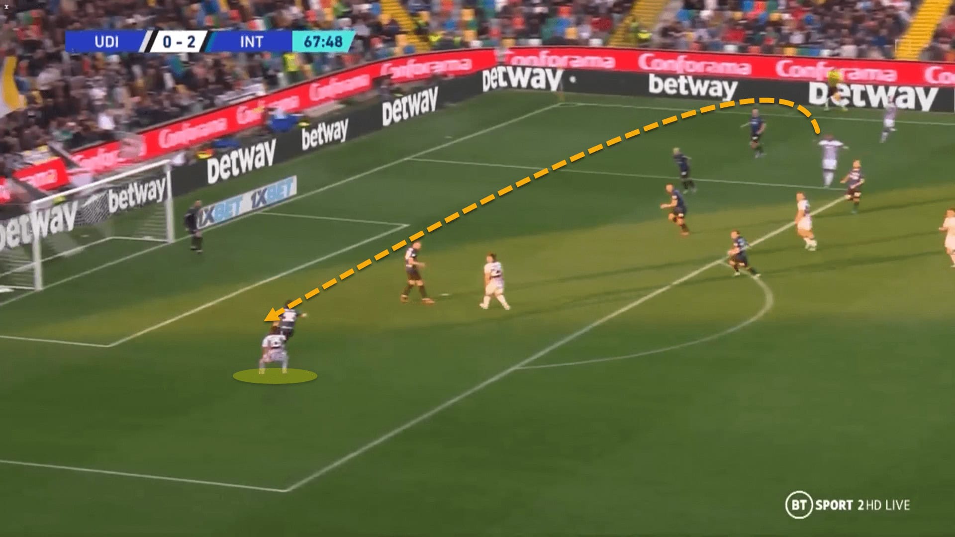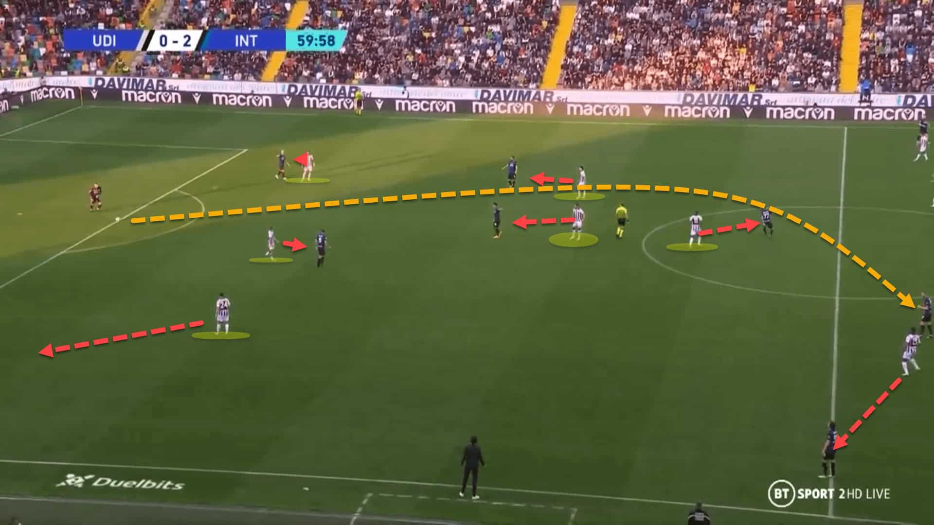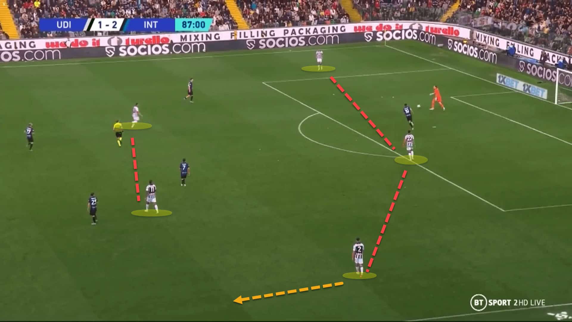 Here, Internazionale are playing out from the back through their goalkeeper. Udinese are defending in a high block, using a man-oriented marking system. However, nobody is closing down the goalkeeper who plays long to the physically present Edin Džeko for easy ball progression.