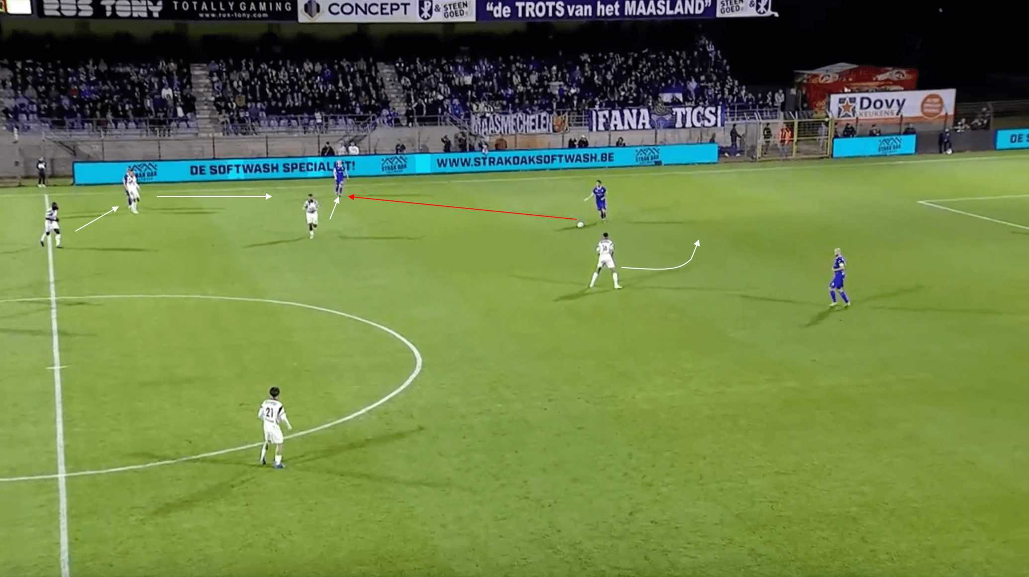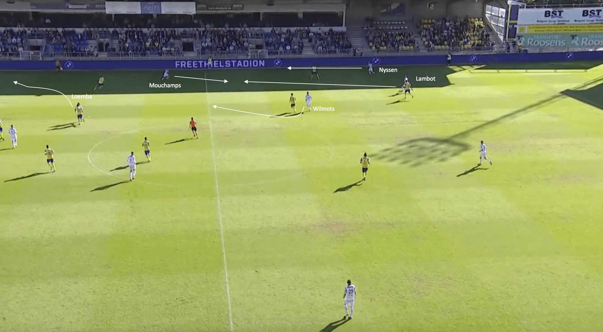 In this phase of play from a recent match against SK Beveren, the ball is currently in possession of the centre-back, Benjamin Lambot. The Belgian defender drives slightly forward before playing into the feet of the wide midfielder, Damien Mouchamps, who drops into a deeper position to receive the ball uncontested. This also attracts the attention of the Bevern fullback, who gets dragged out of position by the movement of the Belgian attacking midfielder.