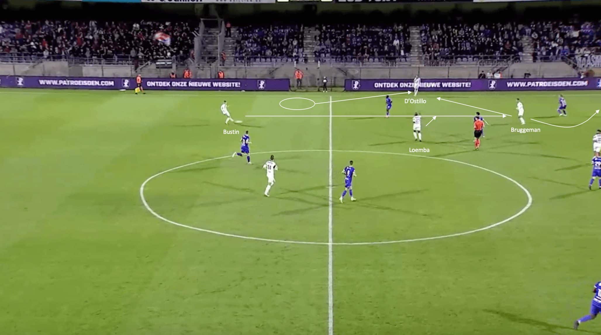 As Bustin plays the ball to Bruggeman, the Belgian midfielder looks to play a quick one-two with D’Ostillo, with the midfielder playing a first-time ball out to the fullback before turning and running beyond the frozen fullback. Unfortunately, the ball played wide forces the fullback to move backwards, allowing time for the Patro Eisden defender to close him down and force him back to where it came from.