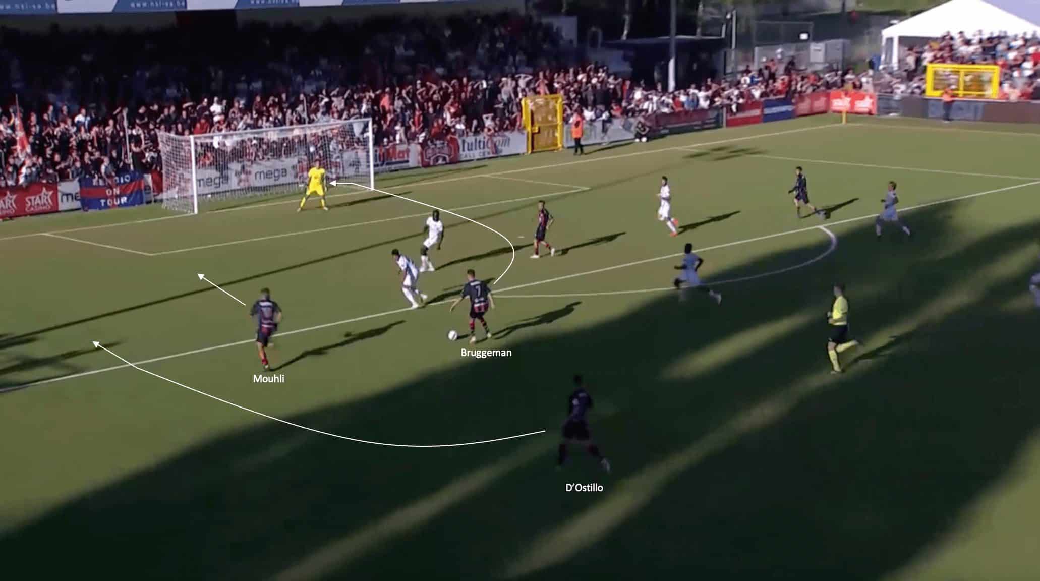 As the Bruggeman begins to slow play down, this allows time for both Mohamed Mouhli and fullback D’Ostillo to make overlapping runs beyond the attacking midfielder, which at the same time makes them potential options to be played endline before sending a ball across the box. However, this time, the width is used as a decoy. Mouhli’s movement catches the Lommel fullback, with him unsure whether to go out and press the player in possession or move wide to mark the overlapping run of the 25-year-old Belgian.