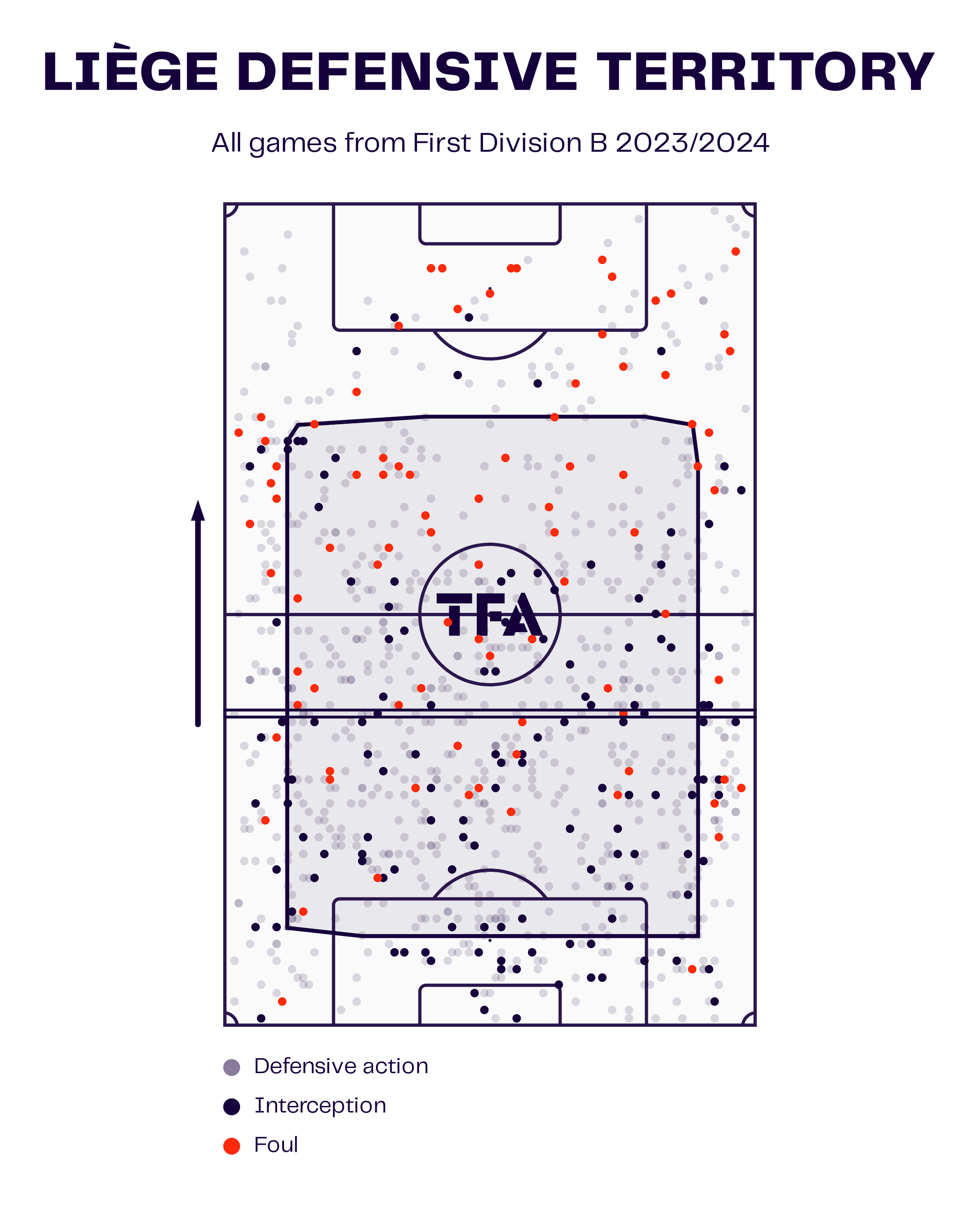 The data viz graphic above shows the defensive territory of RFC Liège this season, highlighting their average line of confrontation and all the defensive actions they have committed this season. As we can see from the graphic, the majority of defensive actions from the Belgian side have occurred in areas in the middle and early defensive third of the pitch. This shows that Liège look to keep the play in front of them, with their defensive line looking to drop off rather than be aggressive and stay high to put pressure on opposition sides.