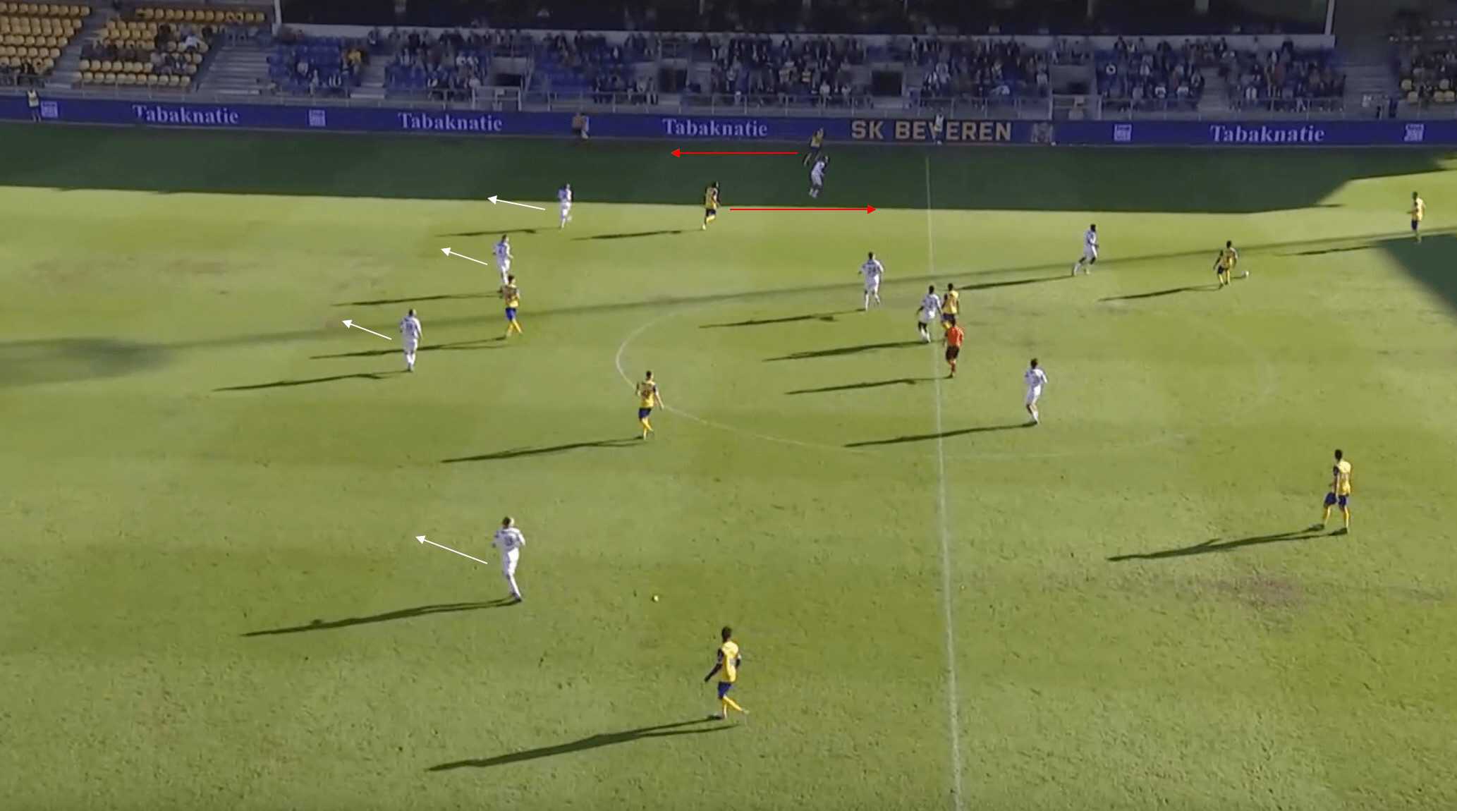 This goes back to keeping the ball in front of them, with the Liège defenders not wanting to be dragged out of position and opening up space for runners to make runs beyond the backline. The ensuing pass from the Beveren defender looks for the striker. Still, it puts too much on the pass, with the Liège fullback able to receive possession and eliminate the Beveren attack. If the defender would have tracked the runner into the midfield, it would have opened up a potential ball over the top of the backline, with the second Beveren striker then able to run into the space that the defender would have vacated.