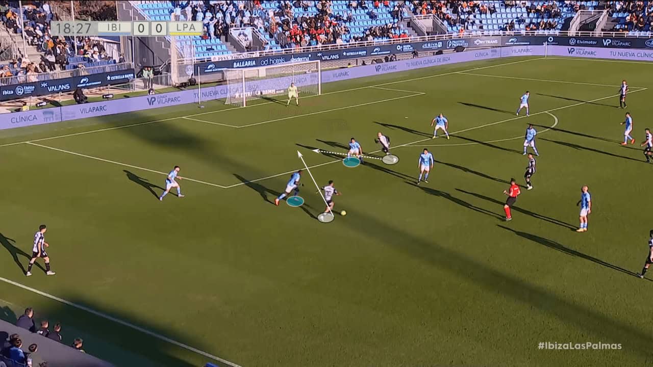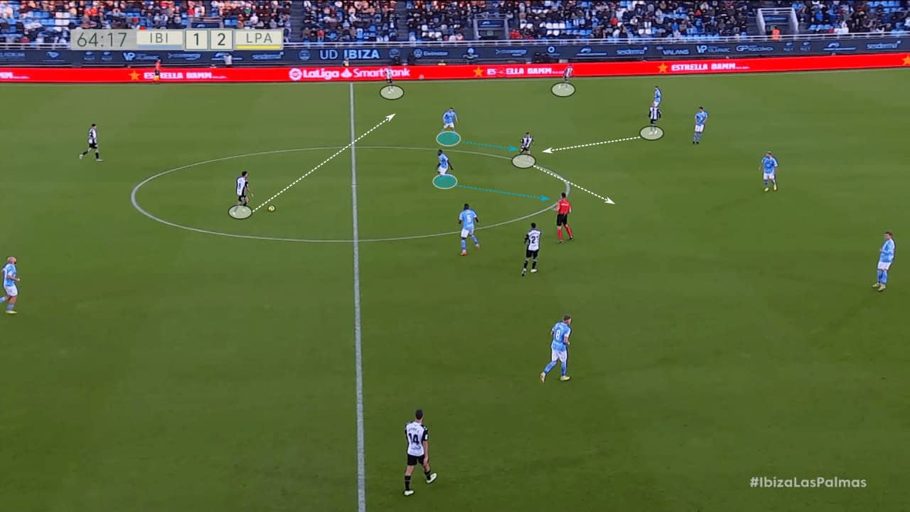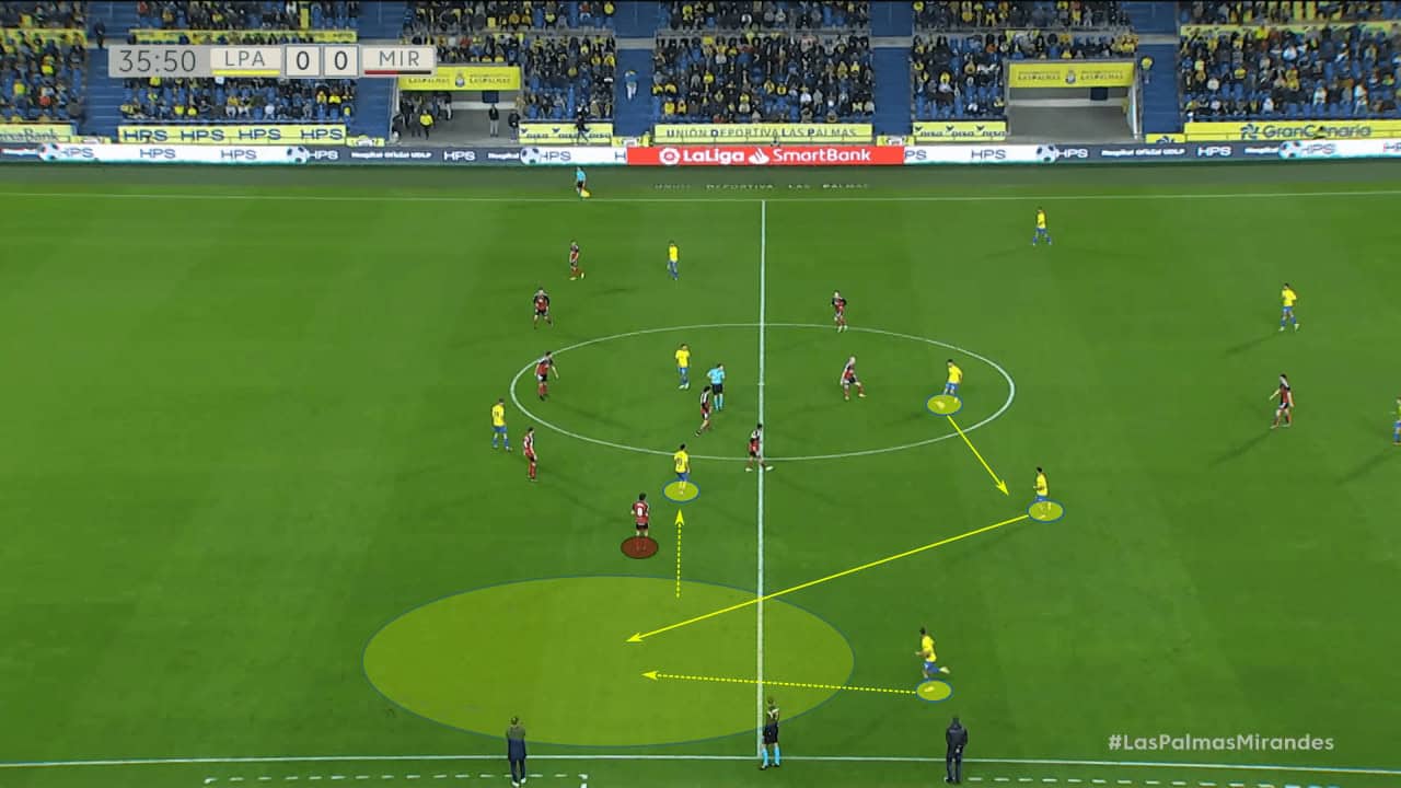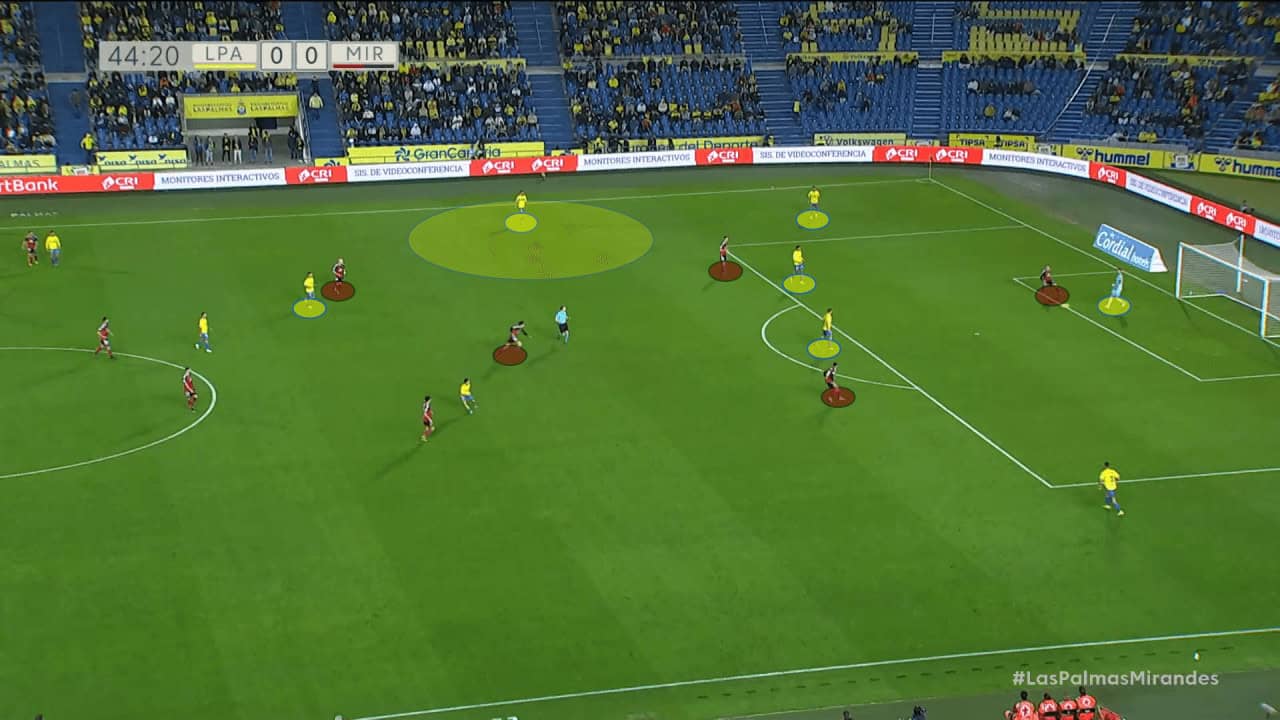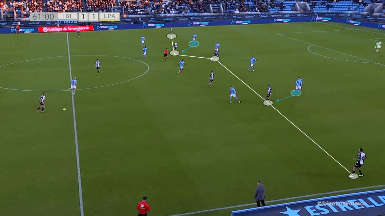The opposition’s right central midfielder follows him, and Las Palmas’ striker checks into the space left behind.
