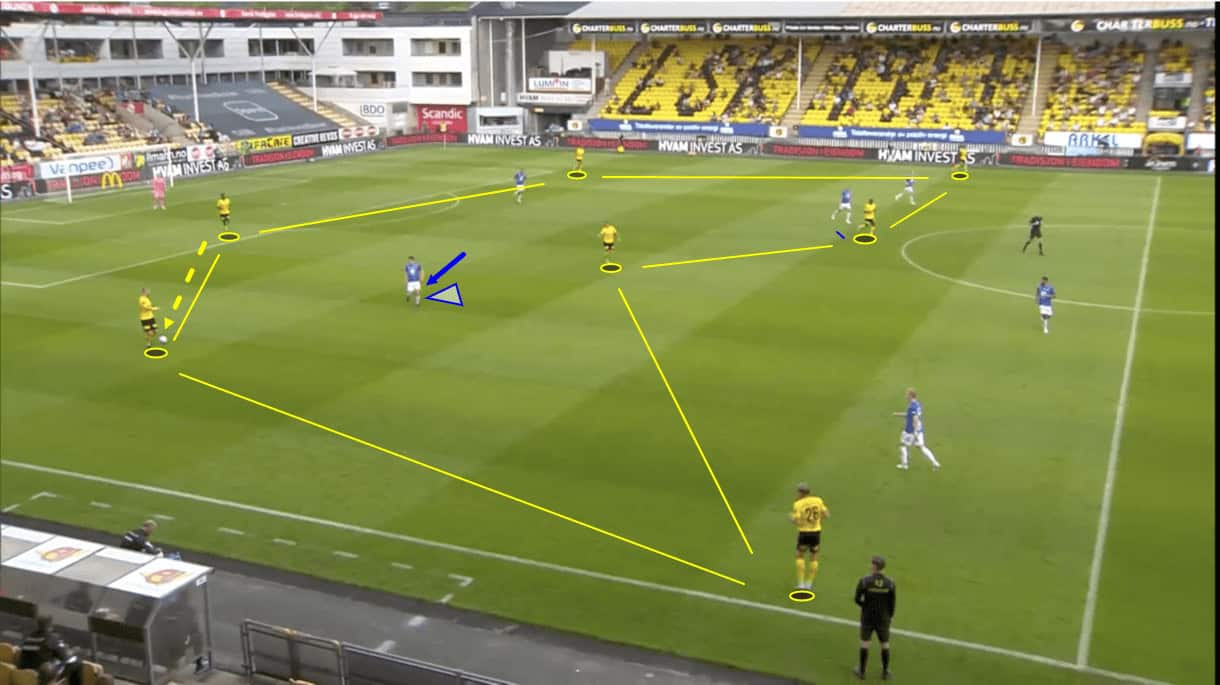 Due to their five-man backline, Kanarifugla’s wing-backs enjoy the freedom to defend quite aggressively if the opposition send the ball out to the wing. We see an example of this in figure 10, where Lillestrøm’s opponents have just sent the ball out to their right-back from the right centre-back. As this pass arrives, Lillestrøm’s left wing-back can step out of defence and close the pass receiver down. This doesn’t weaken the backline much because due to their numbers and the fact they don’t need to worry about the opposite wing too much when the ball is on this side, they can shift over and protect the space behind this pressing wing-back.