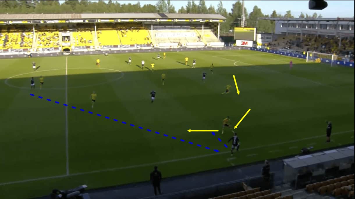 The centre-forward offers little more than a light jog to close the ball-carrier down and as a result, the right central midfielder is forced to step out a bit and attempt to close him down. This essentially creates a 2v1 for the opposition against Lillestrøm’s midfielder and they can pass around him, through midfield, setting up a dangerous attacking scenario quite easily. As play moves on, the ball receiver can turn and run at the Kanarifugla backline.