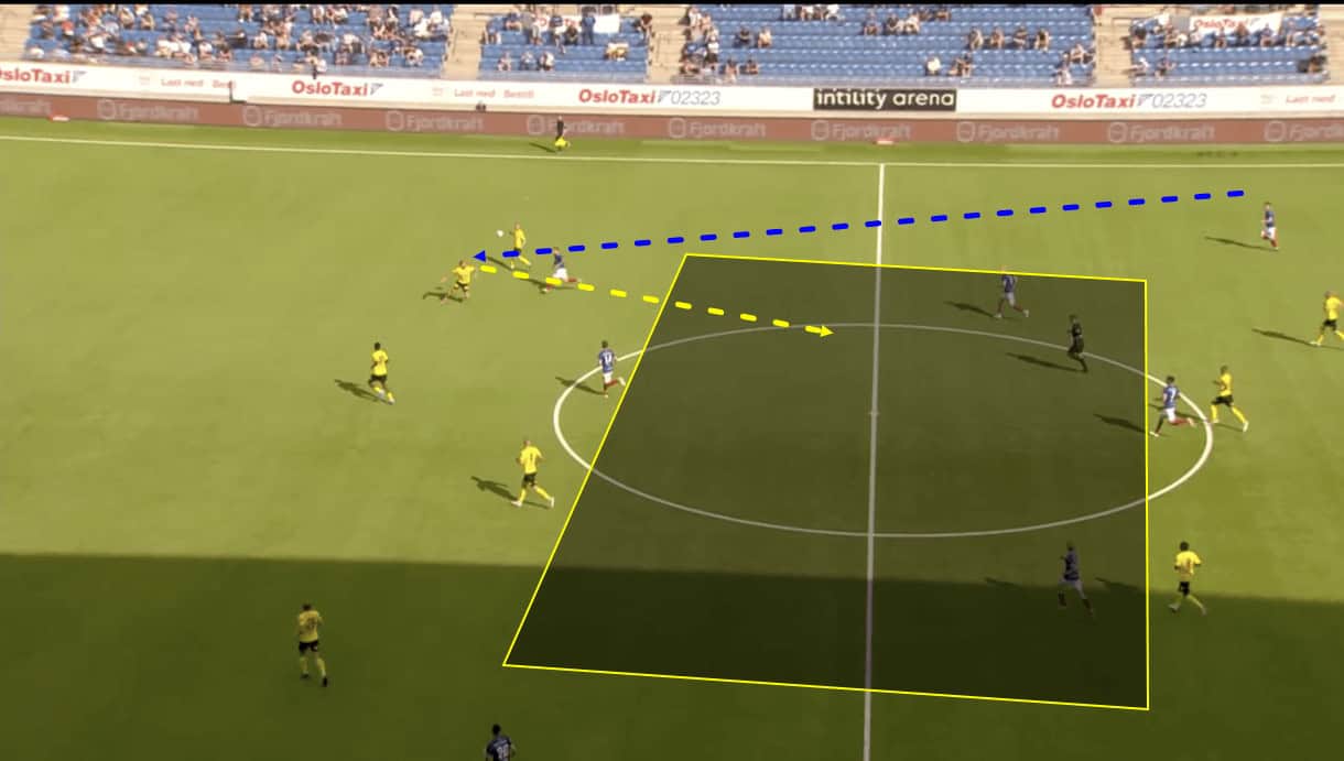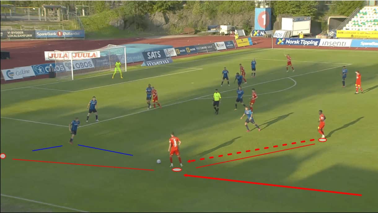 On the other hand, this pass can be a good way for Lillestrøm to play the ball into central midfield, using the wing-back as the third man. However, the opposition player who was covering the passing lane between the centre-back and central midfielder (or another, deeper player) may simply shift to cover the passing lane between the wing-back and central midfielder, leaving the wing-back with nowhere to go but straight back to the centre-back, if even that. So, this isn’t the most optimal pass for Lillestrøm in the build-up. Generally, they tend to play it long if they can’t play through the central midfielders – which is common – and this suits them best given the options available to them and the tools available to them, in terms of the players’ skill-sets.