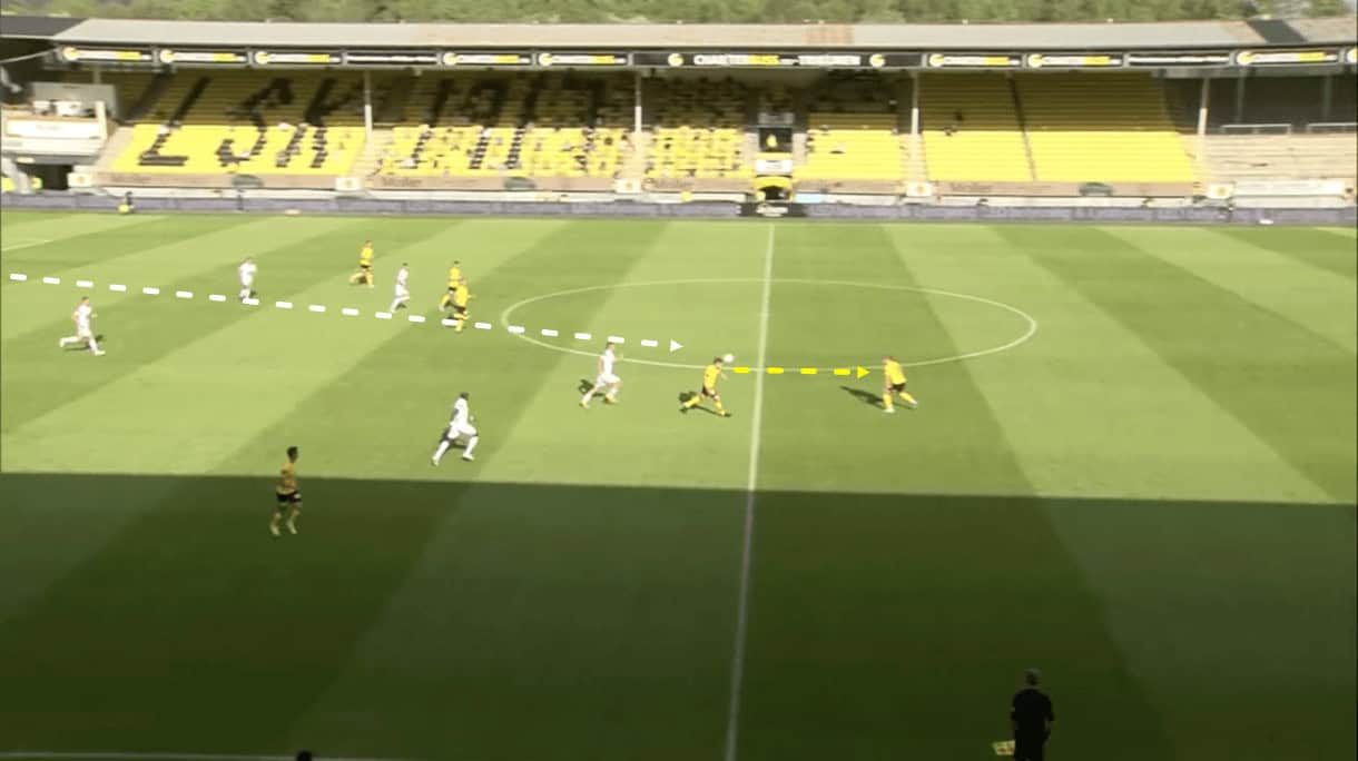 Here, central midfielder Mathew has just found Dragsnes with a short pass on the edge of the final third, on the left wing. The opposition, sitting in their deep-block, simply don’t have this threat accounted for and as a result, Dragsnes becomes a free man and enjoys lots of time and space to put a dangerous cross into the penalty area.