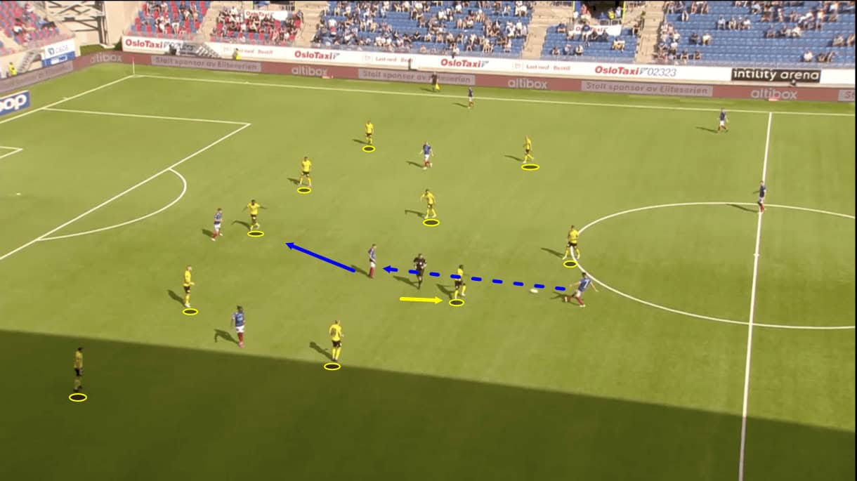 At times, Kanarifugla’s midfielders have been drawn out of position but the pass receiver would have to be positioned further up to attract their attention, making the initial pass into him more difficult and risky. Instead of closing down this pass receiver, Lillestrøm’s focus is on protecting the space between the lines and behind the backline – this is an important element of their defensive style.