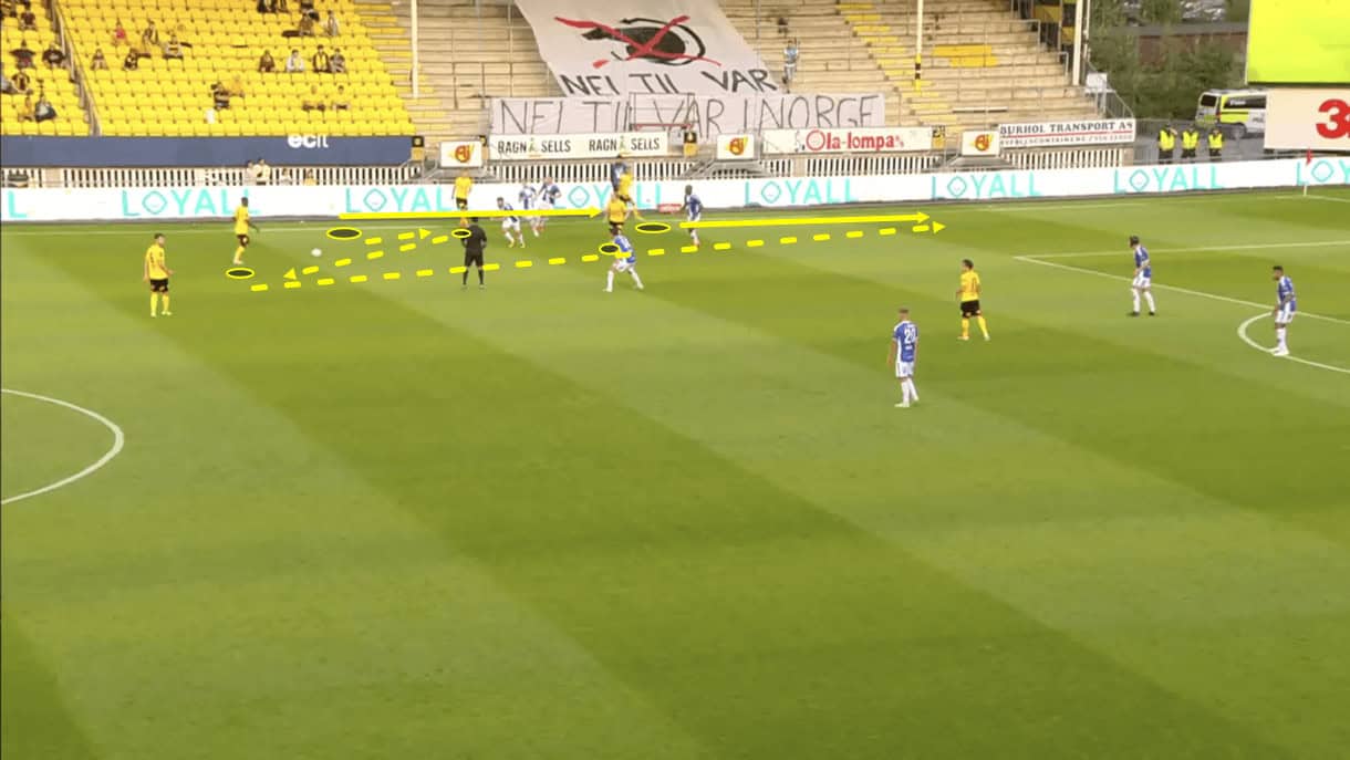 Due to the large distance between the centre-backs and central midfielders, opposition players can close off those passing lanes quite easily, forcing Lillestrøm to progress the ball differently. As a result, when Lillestrøm do build-up via short passes, it’s common to see the ball move from the goalkeeper to the central centre-back to the wide centre-back, as was the case in figure 2.