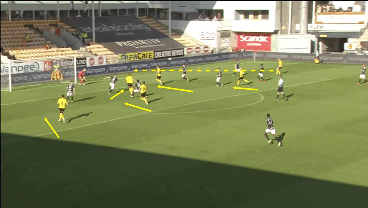 Here, just out of picture, the left wing-back is sitting on the left wing, right on the shoulder of the opposition’s defensive line. As Dragsnes receives the ball, the near opposition defender is overloaded 2v1, caught in two minds about whether to press the centre-back or remain deep to mark the wing-back. Meanwhile, the near opposition player in central midfield has a similar conundrum with Dragsnes and Mathew. This is why Dragsnes remains free and sends a dangerous cross into the box for aerial threat Olsen to attack. Dragsnes is a good crosser, so Bakke has done well to find a creative way to free him up inside the final third so much.