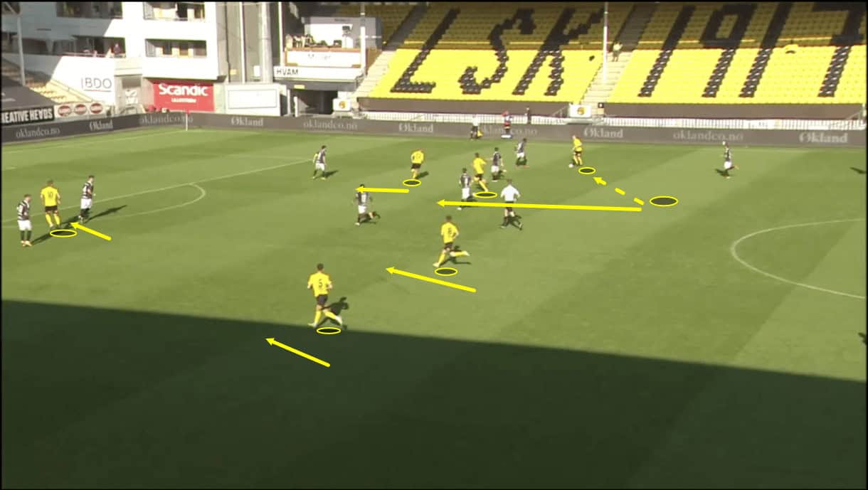Sometimes, opposition sides match Lillestrøm out wide but even when they do, they struggle to deal with the quality of Kanarifugla’s fluid, one-touch passing and intelligent movement out wide. This, combined with the sheer numbers packed into this area, makes them very difficult to stop when they try to break teams down via these wide overloads. In this case, however, as is common, Lillestrøm outnumber the opposition with their pentagon and can momentarily turn the game into a training ground passing and movement exercise. It’s common to see Lillestrøm momentarily isolate opposition players 2v1 in these situations, play around them and progress the ball like this. Bakke’s side have been breaking down teams frequently this term thanks to this wide overload.