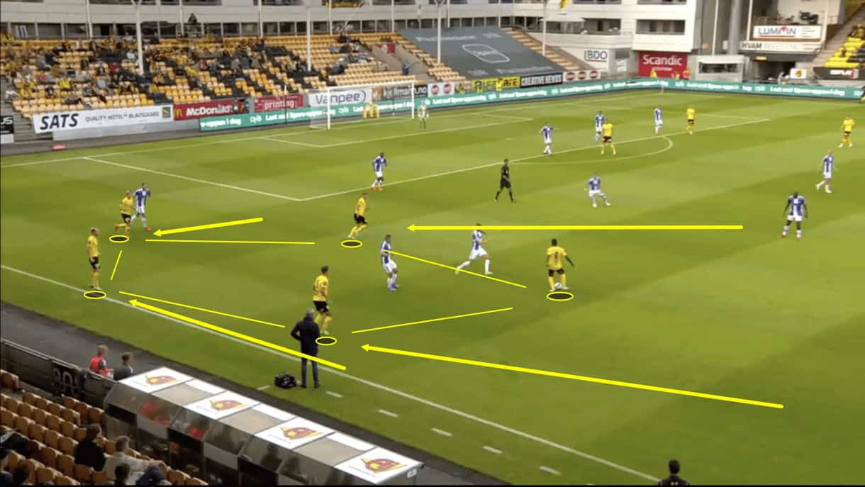It’s very common to see the sight shown in figure 3 during Lillestrøm games, with five Kanarifugla players essentially forming a pentagon on the wing. This is typically formed with the two central midfielders, the winger, the wing-back and the wide centre-back, as was the case in figure 3. We see how, once again, the central midfielders are staggered, with one acting more as a ‘10’ and the other sitting slightly deeper.