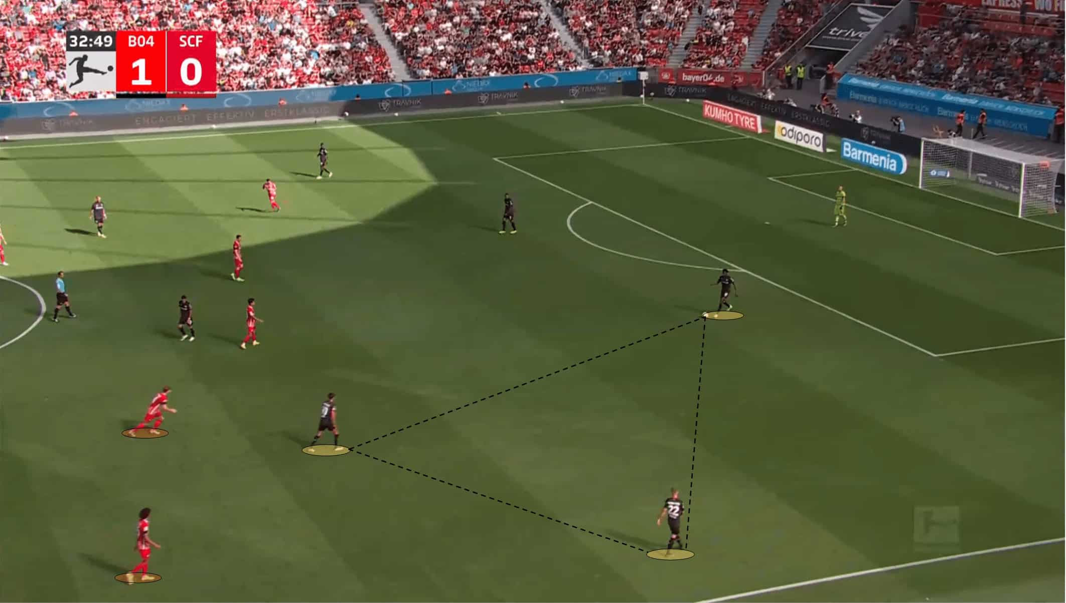 In the next season and as we can see in the image above, M’Gladbach under Seoane should expect a 4-2-3-1 as a usual formation while in possession, with the fullbacks having a special importance in their offensive tactics. Yet, the Swiss coach, when managing Bayer Leverkusen earlier this season, in possession built up in a three-man backline, but unfortunately, this alternative did not end up the way he wanted.