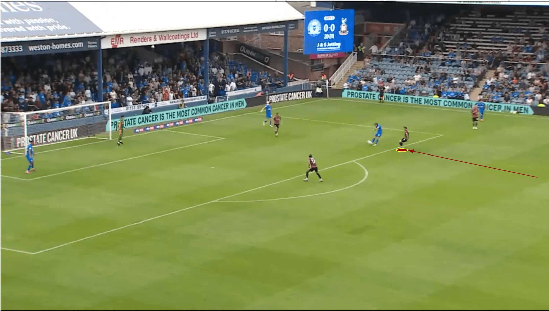 Here, while building out from deep, Power moves out of the Peterborough forward’s cover shadow, finding space on the wing where he can receive from the left centre-back, Curtis Tilt.