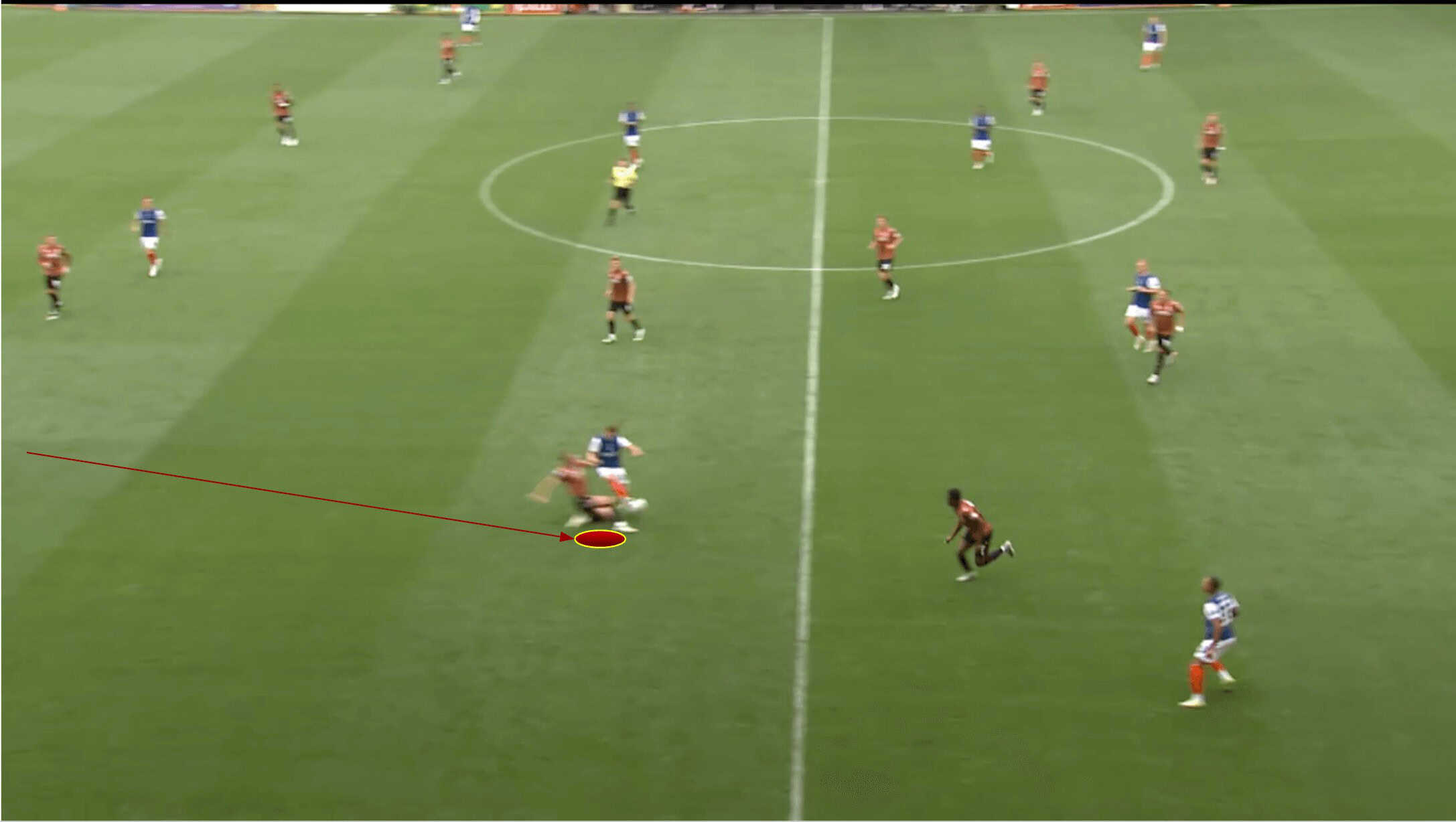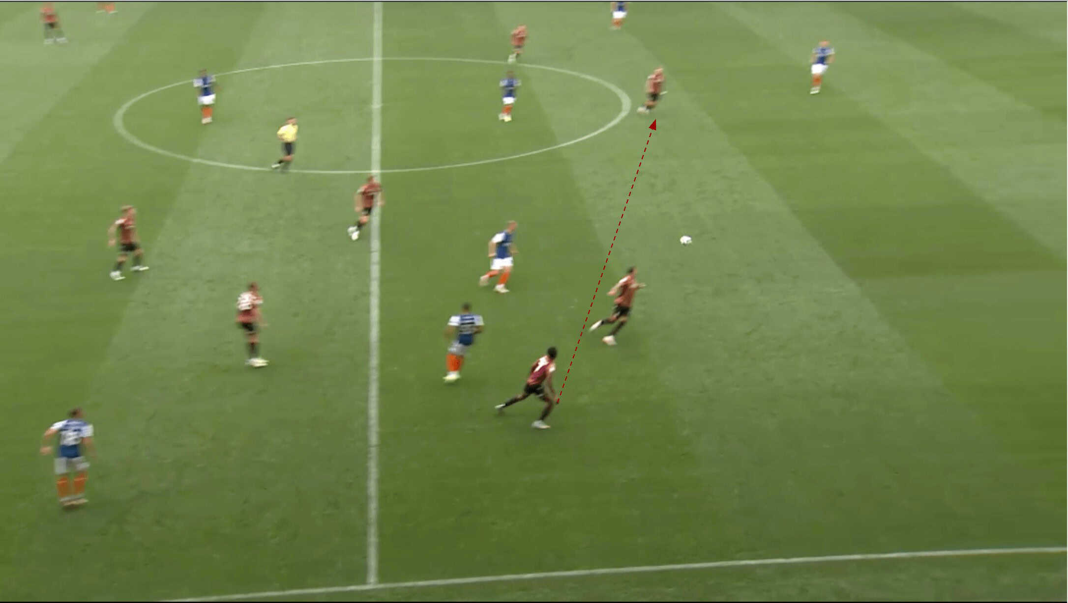 Before the long ball had been played by Luton’s left centre-back, Pointon was sitting in this position, retaining access to the right centre-back should he need to press.