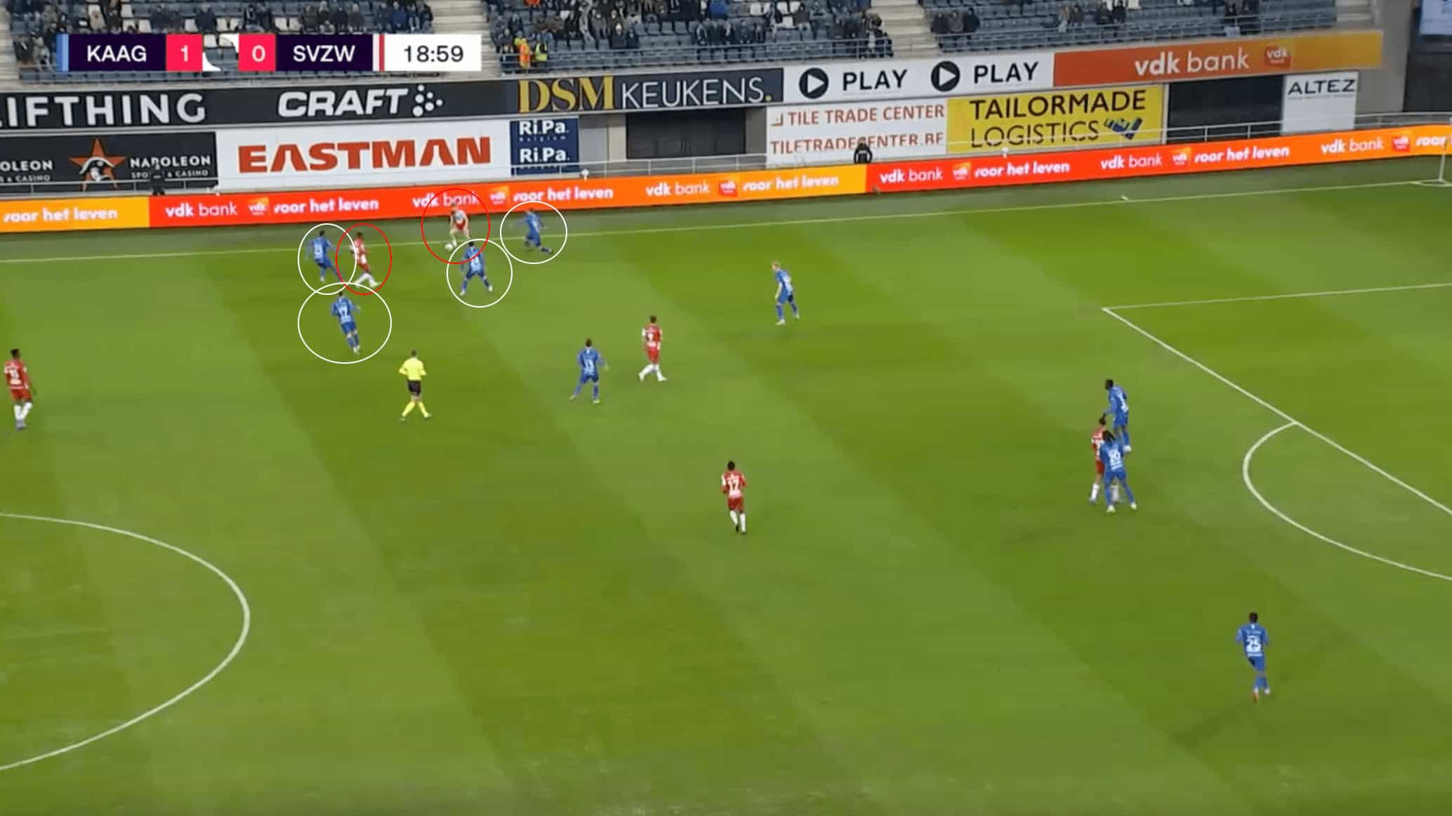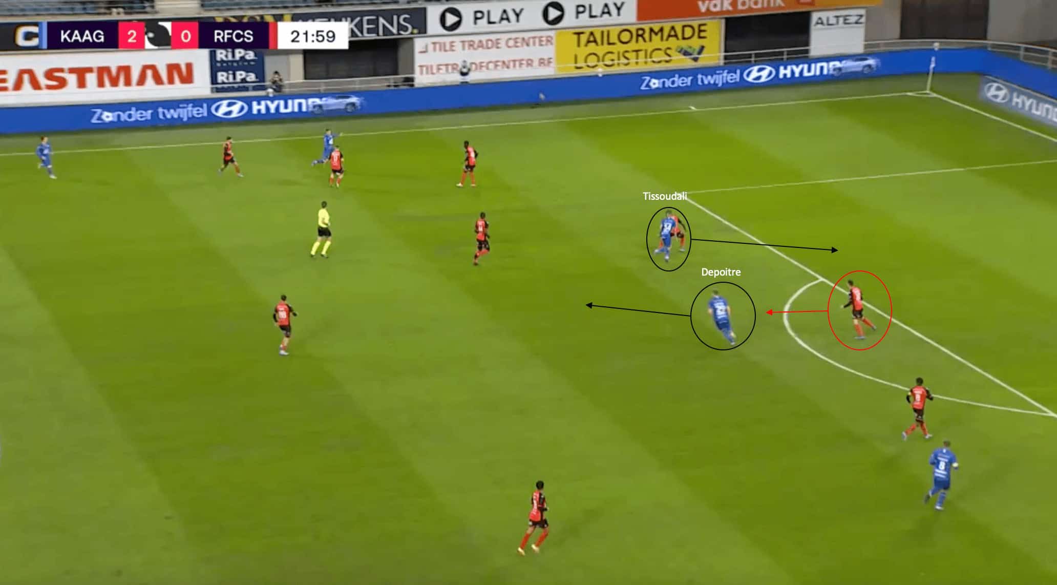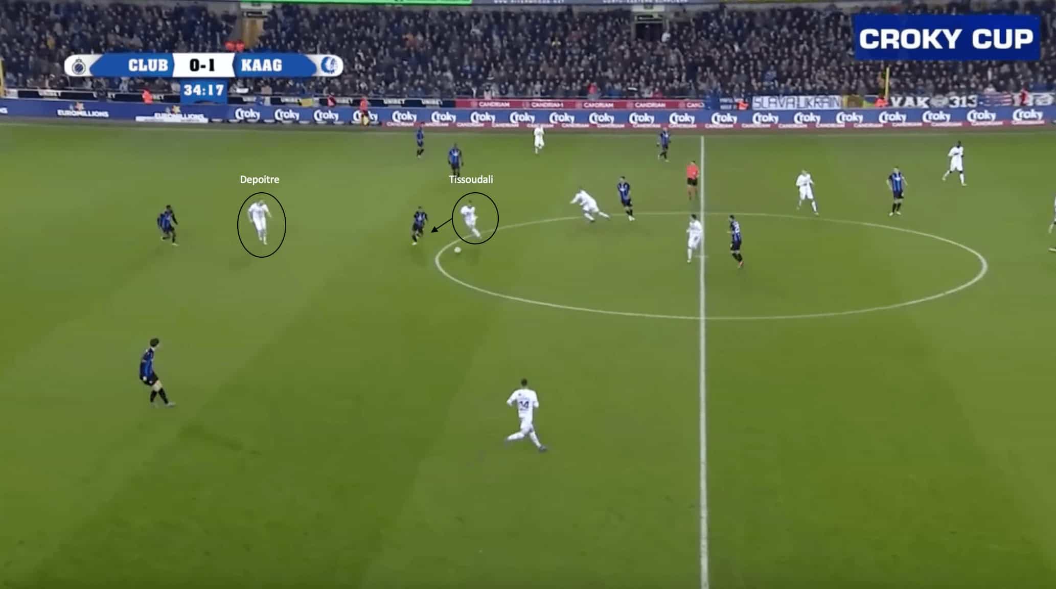 Depoitre, anticipating this decision, drops deeper into midfield, attracting the attention of the Seraing defender circled in red.