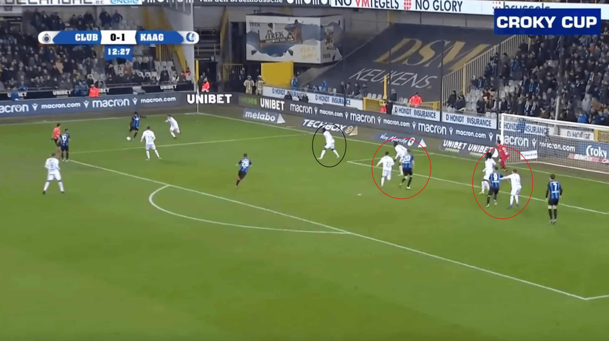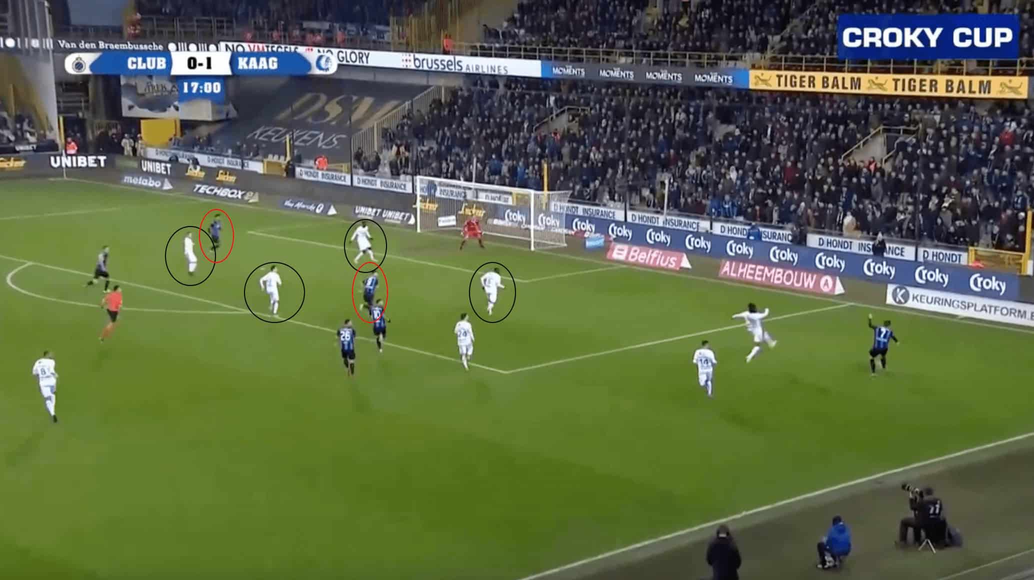 Notice how both of the central attacking options for Club Brugge are man-marked by two Gent defenders each, making it almost impossible for a Club Brugge player to get onto the end of the ensuing cross.