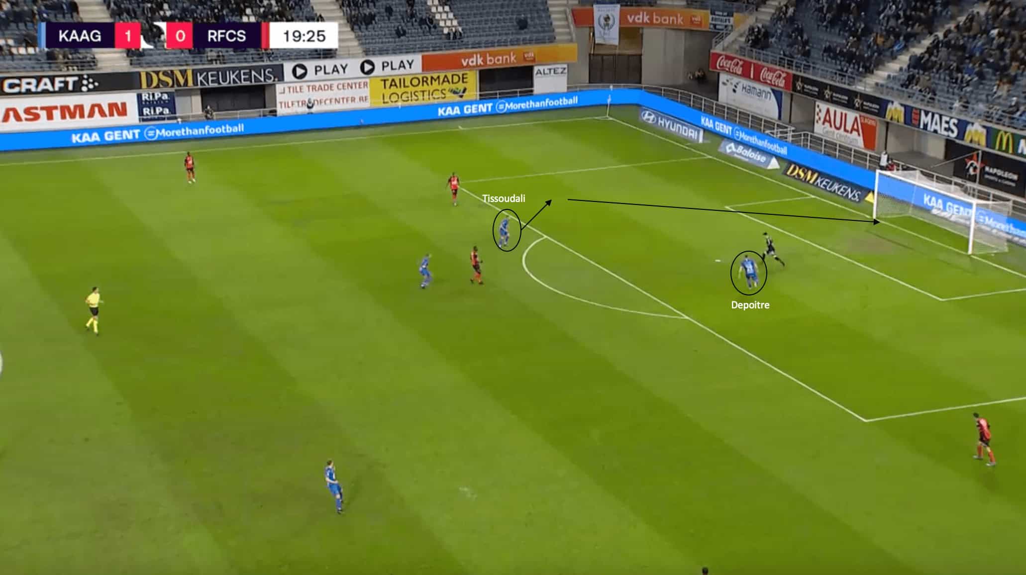 The Gent player in possession plays a perfect ball through, which Tissoudali scores.
