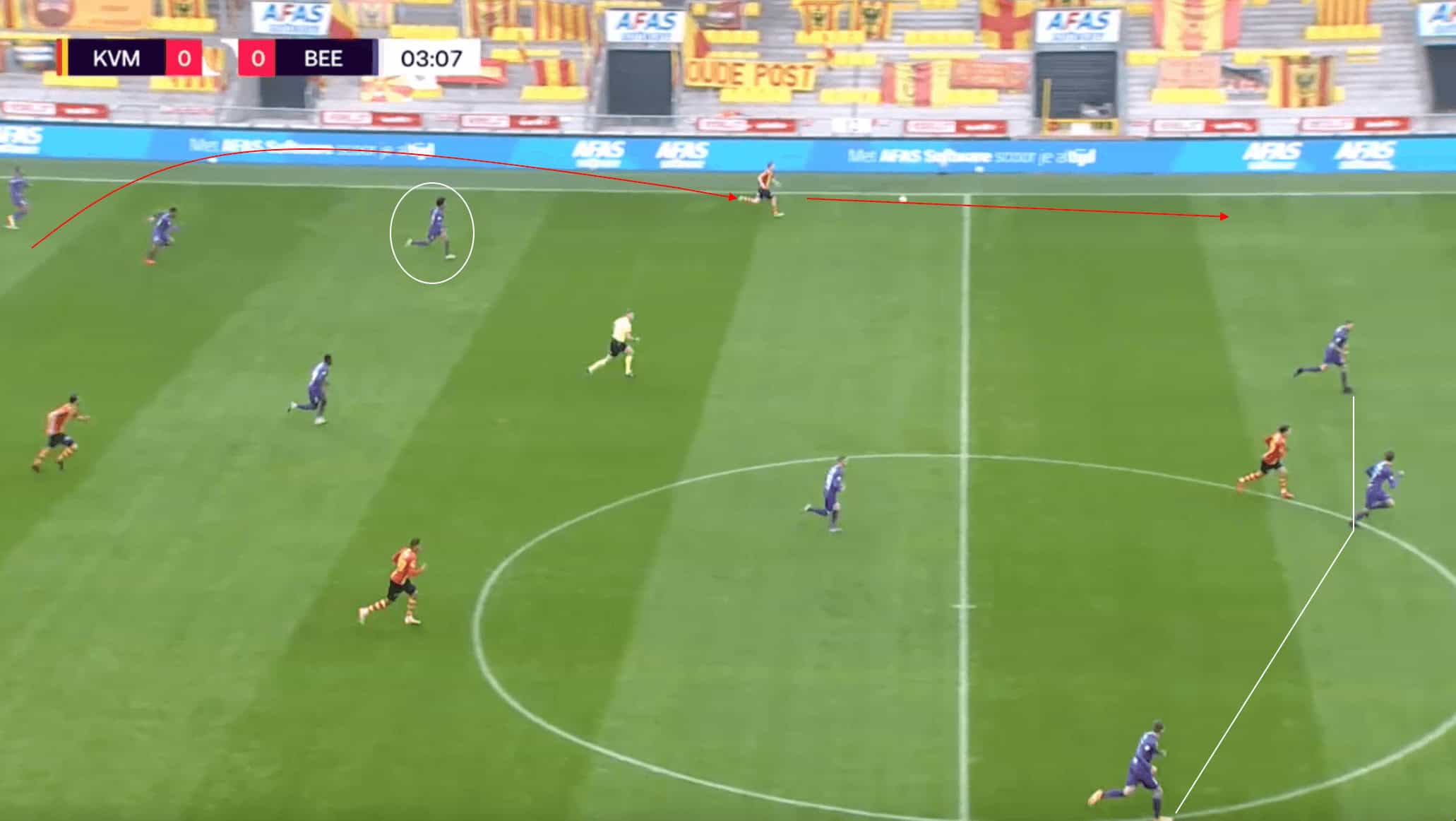 The image above shows an example of why being an aggressive front-foot defending team can be a risk at times. In the phase of play above, Mechelen were able to get out of the high press that Beerschot were trying to trap them with. As a result, the ball over the top releases the Mechelen winger and allows him acres of space to run into down the right flank.
