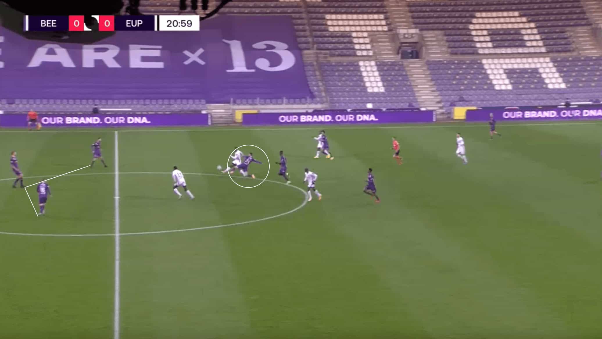The image above shows an example of the positives when it comes to being successful at front-foot aggressive defending. After losing possession in the attacking half of the field, the defensive phase begins for Beerschot. Though Eupen are looking to counter quickly, the Beerschot midfielders are able to quickly recover, with the one putting in a very good tackle on the player in possession, which allows the home side to regain possession and continue to build.