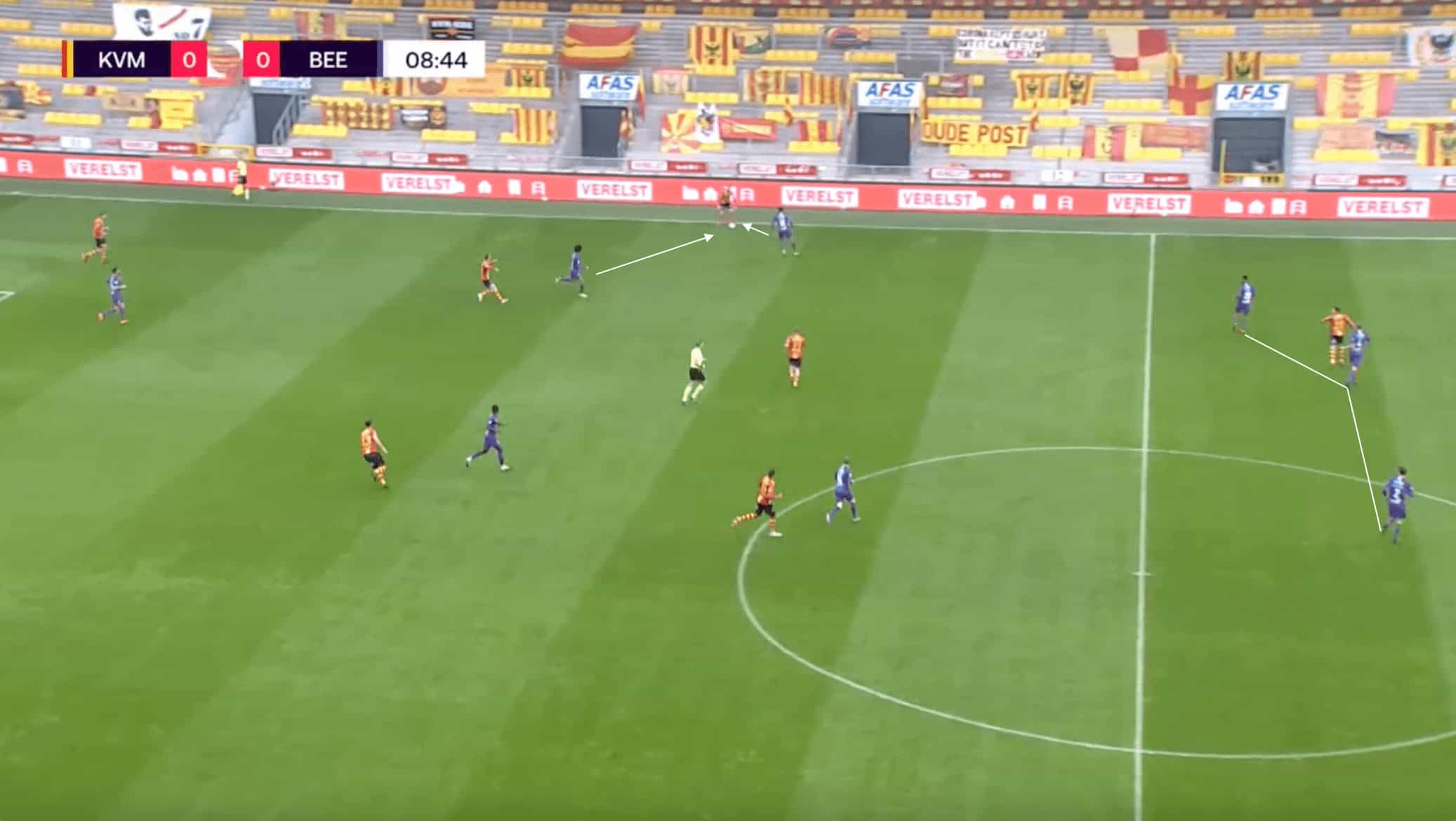 In this phase of play, Beerschot looked to force the play to one side and then quickly close the ball carrier down, pinning them in and regaining possession in a dangerous area as a result. They were not successful in this example, with Mechelen playing the ball to the weak side and getting into the Beerschot defensive half.